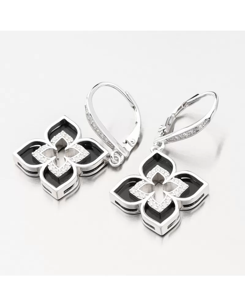 Strieborné náušnice kvety so zirkónmi as onyxom PKL-2197