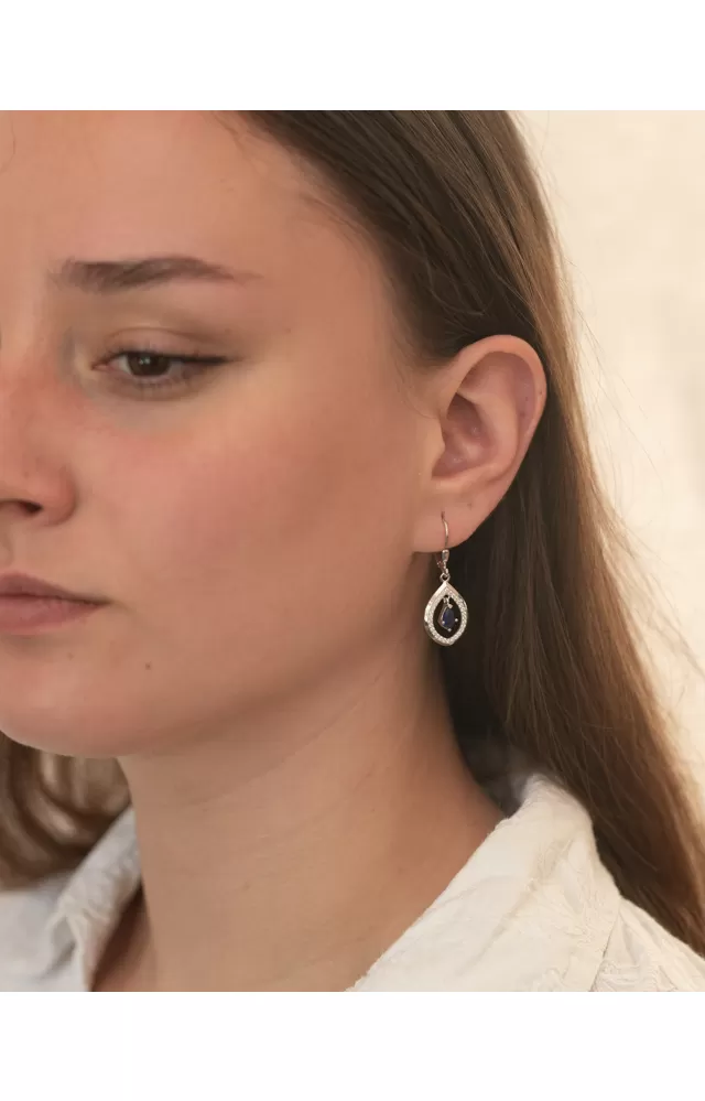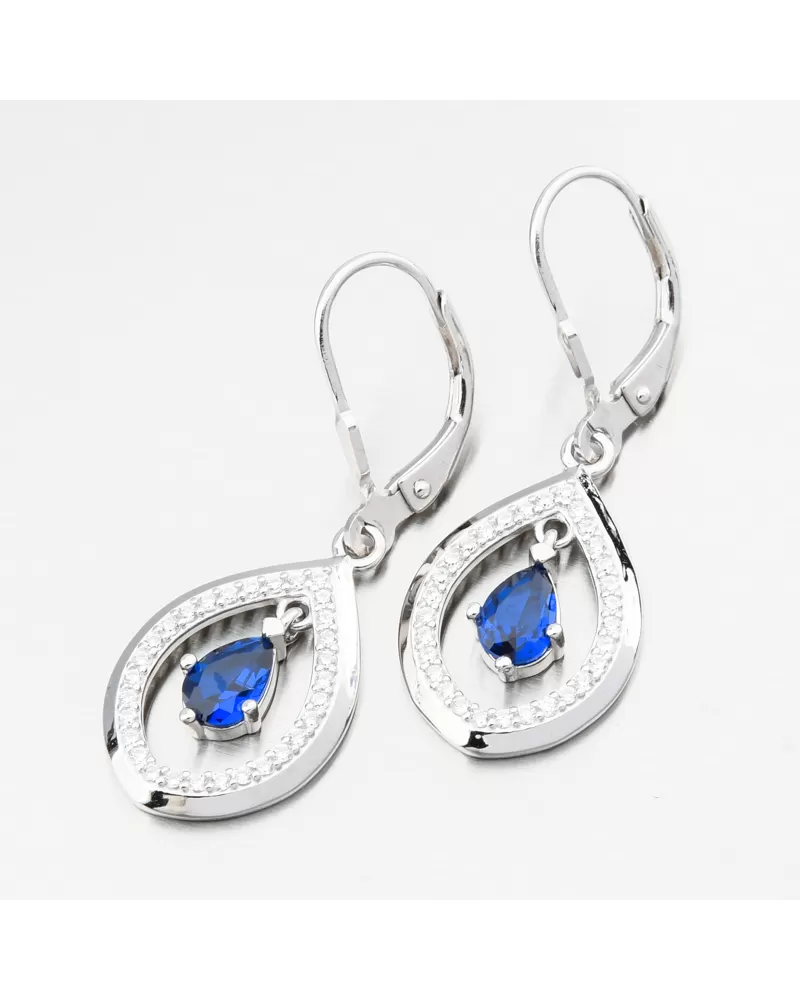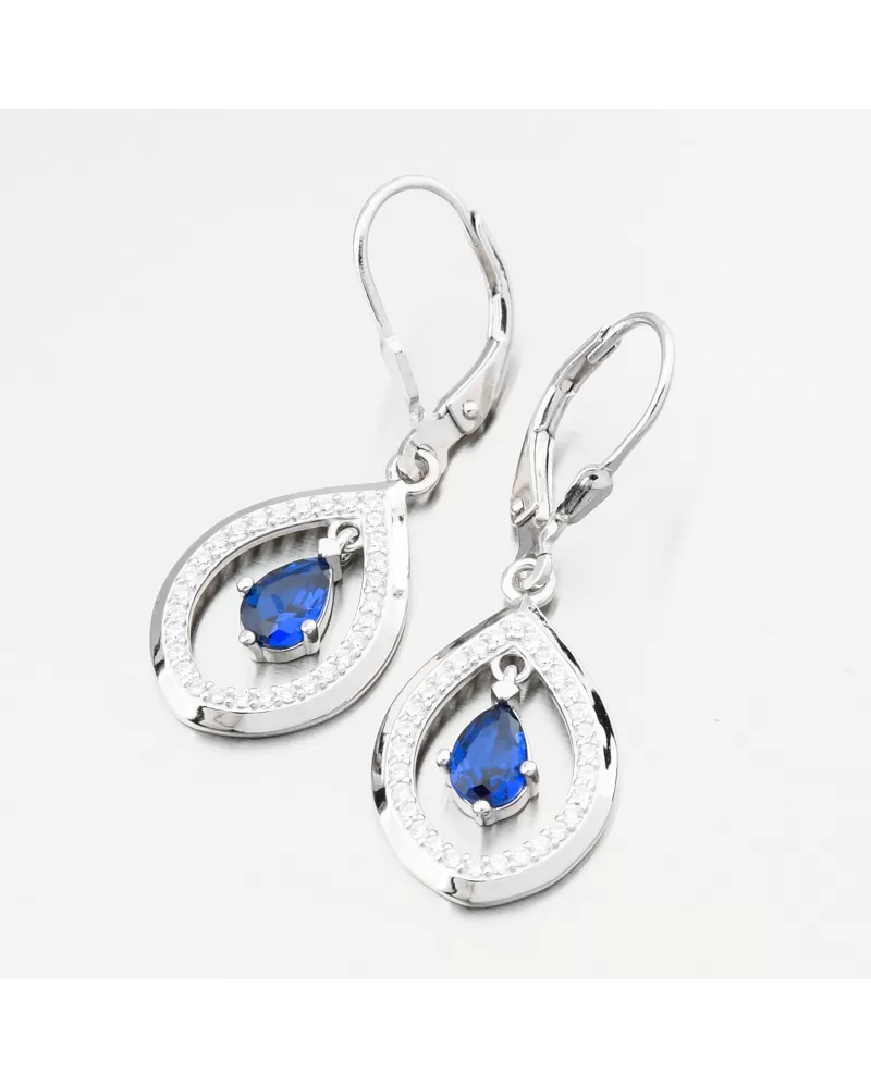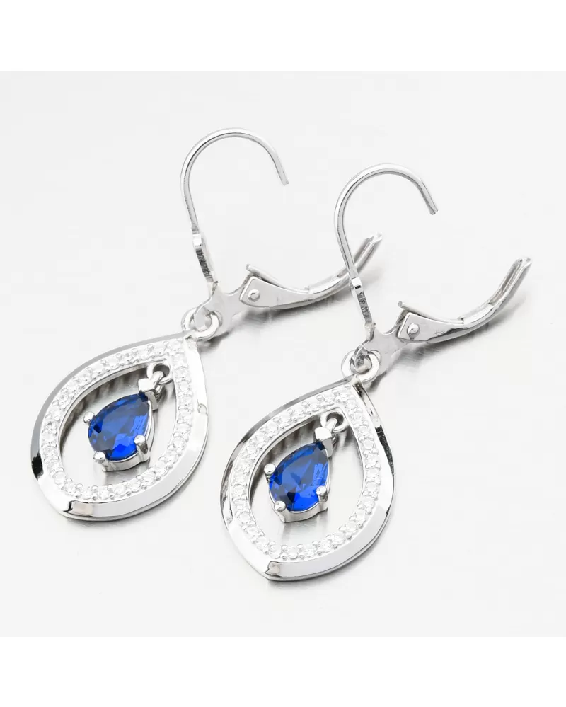 Náušnice určené pre spoločenské udalosti alebo iné dôležité udalosti, ktoré chcete byť krásni. Ozdoba náušníc má výrazný syntetický zafír v tvare sĺz, ktoré sa v strede pripevňujú v strede pomocou štyroch šrotu. Okrem toho sú malé okrúhle zirkóny lemované celou dekoráciou v tvare sĺz. Round Zirkóny sú brilantným strihom, ktorý poskytuje maximálnu brilanciu leštenej stránky, dokonale odráža svetlo a neuveriteľne svieti zo všetkých pohľadov.