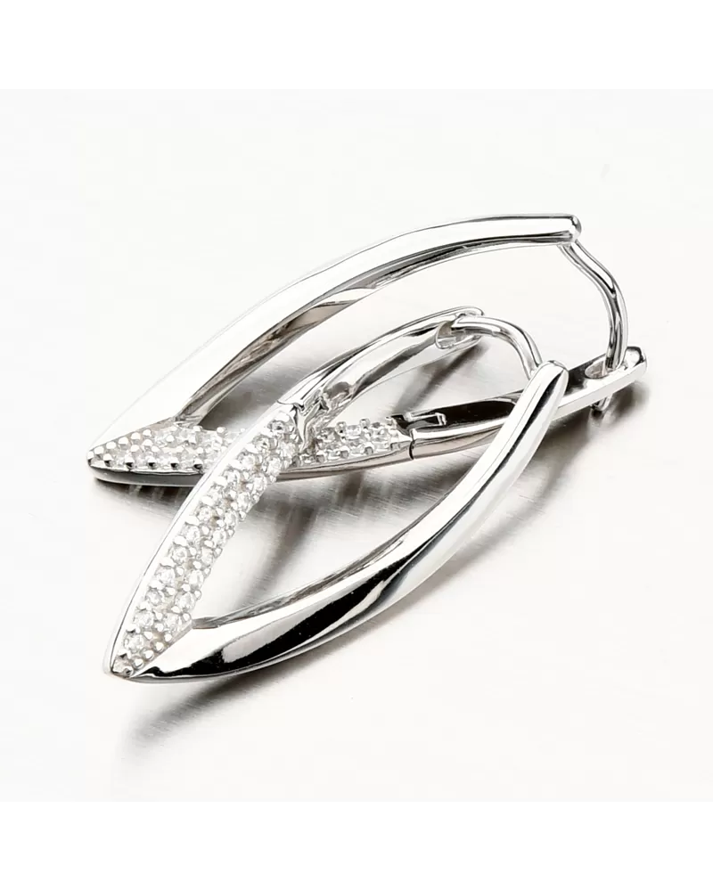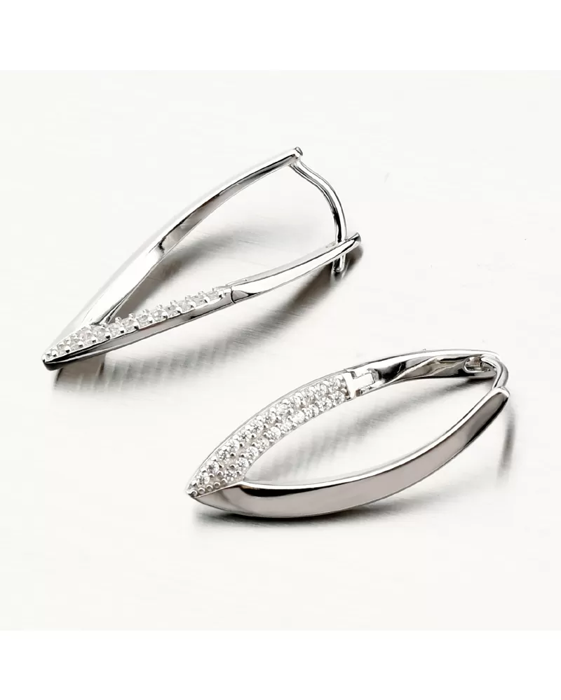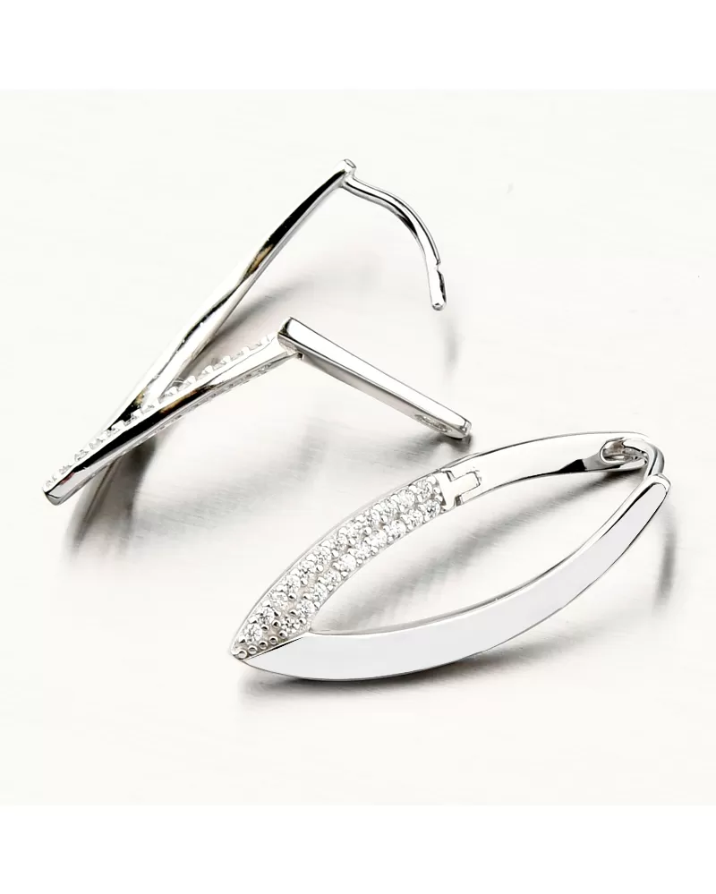 Elegantné visiace strieborné náušnice pre ženy, ktoré chcú zažiariť. Náušnice sú do tvaru písmena V, kde predná polovica je vo vysokom lesku a zadná polovica je osadená trblietavými zrikónmi. Výhodou týchto náušníc je, že ich tvar a že sa vzájomne neprekrývajú, preto dávajú vyniknúť žiarivým kameňom. Zirkóny sú briliantového brusu, ktorý zaisťuje maximálnu brilanciu vybrúsených facet, dokonale odráža svetlo a neuveriteľne žiari z každého uhla pohľadu.