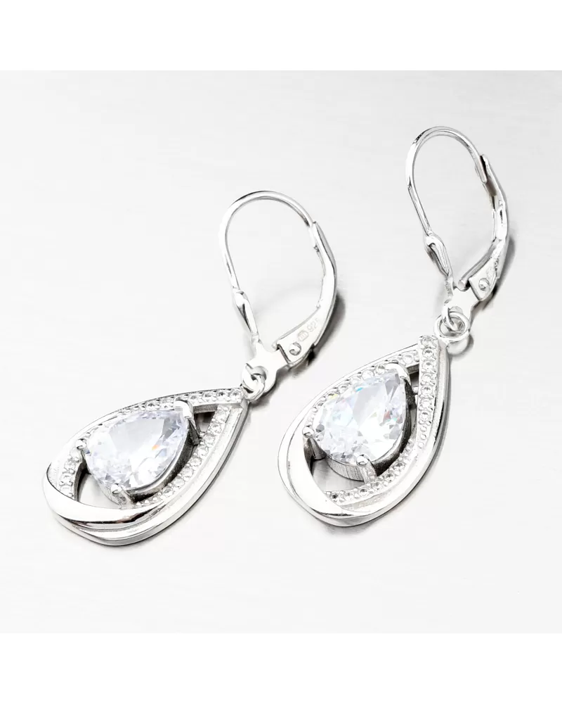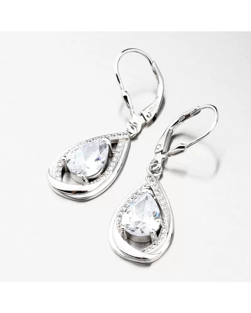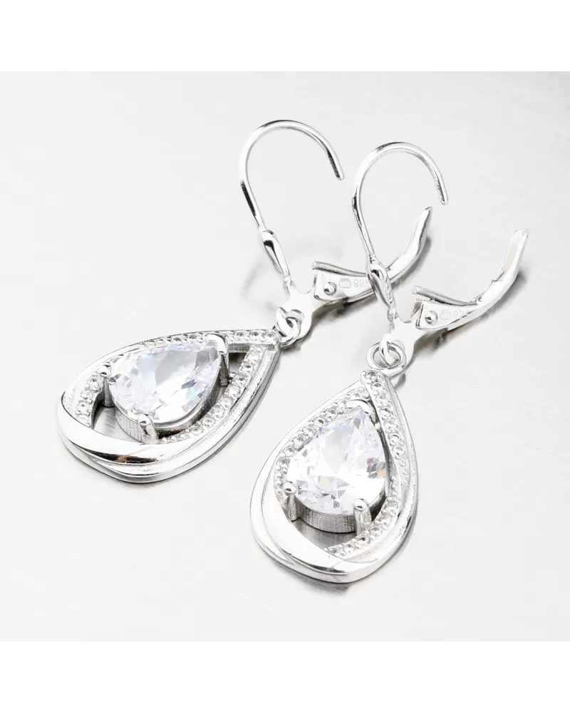 Náušnice stvorené pre spoločenské udalosti alebo iné významné udalosti pri ktorých si prajete byť krásna. Ozdoba náušníc má výrazný zirkón v tvare slzy, ktorý je upevnený pomocou troch krapien. Ďalej sú drobné okrúhle zirkóny osadené po stranách. Okrúhle zirkóny sú briliantového brusu, ktorý zaisťuje maximálnu brilanciu vybrúsených facet, dokonale odráža svetlo a neuveriteľne žiari z každého uhla pohľadu.