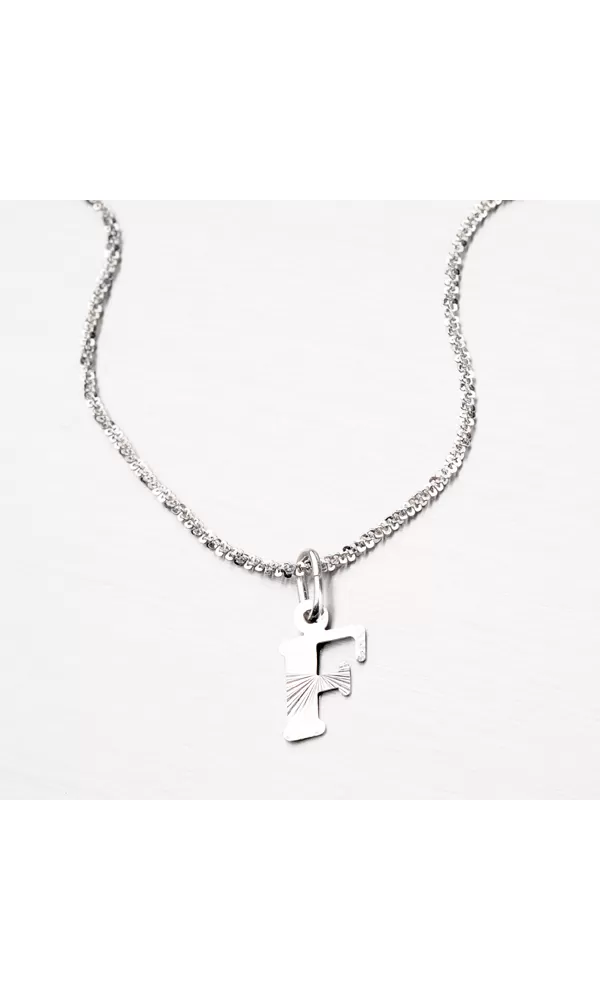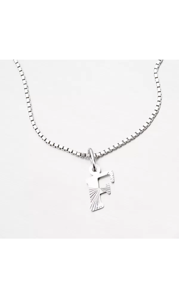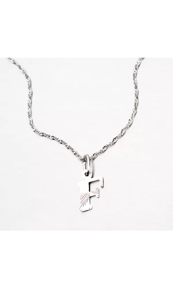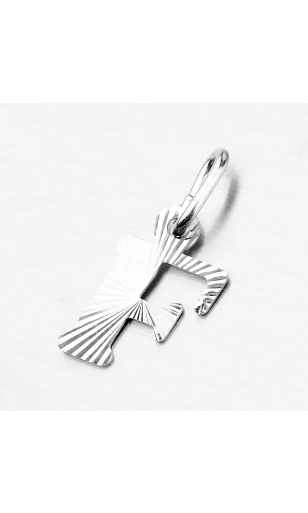 Prívesok v tvare písmenka F je vyrobený z rhodiovaného striebra rýdzosti 925/1000. Ródium je ušľachtilý drahý kov zo skupiny platinových kovov. Rhodiovaním strieborných šperkov galvanickým nanášaním tohto drahého platinového kovu sa stáva povrch šperku tvrdší, stálejší a odolnejší voči vonkajším vplyvom ako je mechanický oter, poškriabanie, nabiehanie striebra, ľudský pot, kozmetické prípravky a ďalšie. Ródium je antialergické. Prívesok je vyrobený v lesklej povrchovej úprave s facetami, ktoré sú robené za pomoci diamantového nástroja a dodávajú šperku maximálny lesk a brilanciu zo všetkých uhlov. K prívesku je vhodné použiť retiazku s priemerom 2,50 mm.
