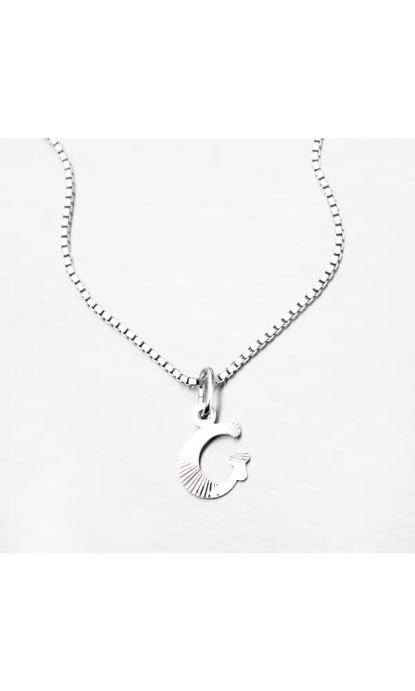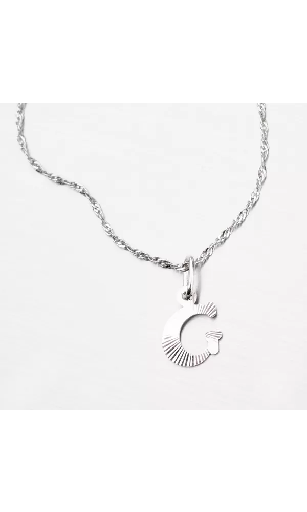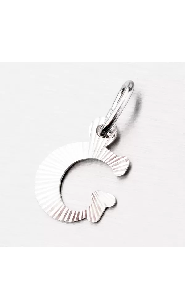 Prívesok v tvare písmenka G je vyrobený z rhodiovaného striebra rýdzosti 925/1000. Ródium je ušľachtilý drahý kov zo skupiny platinových kovov. Rhodiovaním strieborných šperkov galvanickým nanášaním tohto drahého platinového kovu sa stáva povrch šperku tvrdší, stálejší a odolnejší voči vonkajším vplyvom ako je mechanický oter, poškriabanie, nabiehanie striebra, ľudský pot, kozmetické prípravky a ďalšie. Ródium je antialergické. Prívesok je vyrobený v lesklej povrchovej úprave s facetami, ktoré sú robené za pomoci diamantového nástroja a dodávajú šperku maximálny lesk a brilanciu zo všetkých uhlov. K prívesku je vhodné použiť retiazku s priemerom 2,50 mm.
