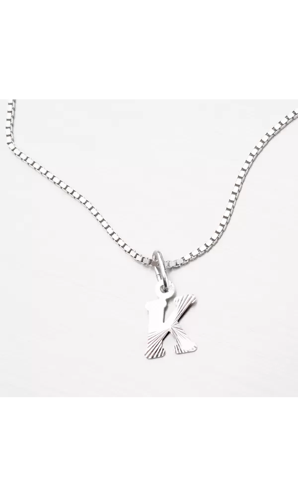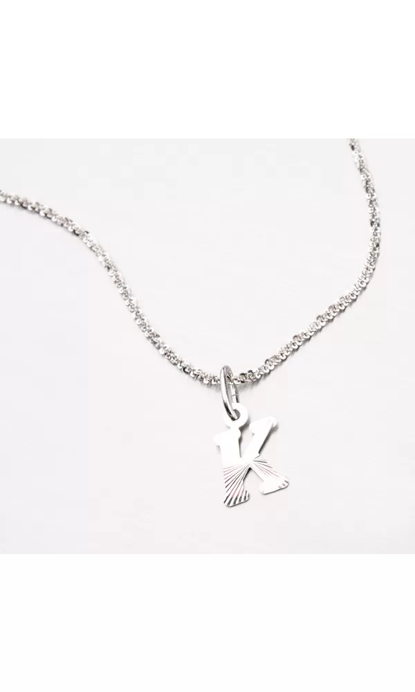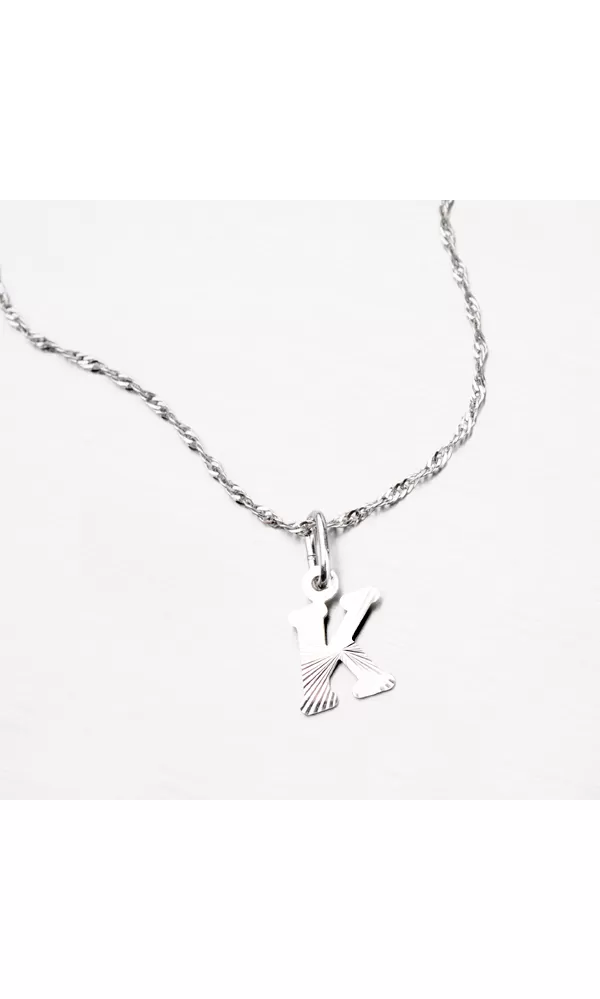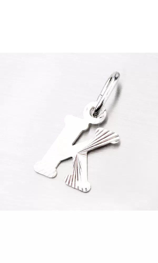 Prívesok v tvare písmenka K je vyrobený z rhodiovaného striebra rýdzosti 925/1000. Ródium je ušľachtilý drahý kov zo skupiny platinových kovov. Rhodiovaním strieborných šperkov galvanickým nanášaním tohto drahého platinového kovu sa stáva povrch šperku tvrdší, stálejší a odolnejší voči vonkajším vplyvom ako je mechanický oter, poškriabanie, nabiehanie striebra, ľudský pot, kozmetické prípravky a ďalšie. Ródium je antialergické. Prívesok je vyrobený v lesklej povrchovej úprave s facetami, ktoré sú robené za pomoci diamantového nástroja a dodávajú šperku maximálny lesk a brilanciu zo všetkých uhlov. K prívesku je vhodné použiť retiazku s priemerom 2,50 mm.