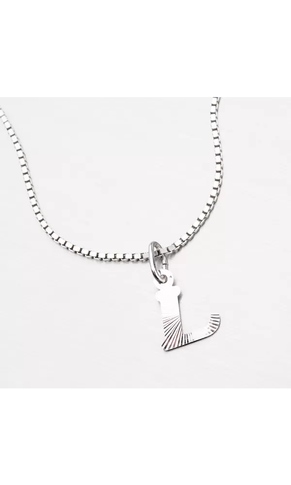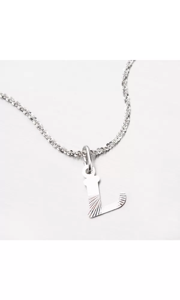 Prívesok v tvare písmenka L je vyrobený z rhodiovaného striebra rýdzosti 925/1000. Ródium je ušľachtilý drahý kov zo skupiny platinových kovov. Rhodiovaním strieborných šperkov galvanickým nanášaním tohto drahého platinového kovu sa stáva povrch šperku tvrdší, stálejší a odolnejší voči vonkajším vplyvom ako je mechanický oter, poškriabanie, nabiehanie striebra, ľudský pot, kozmetické prípravky a ďalšie. Ródium je antialergické. Prívesok je vyrobený v lesklej povrchovej úprave s facetami, ktoré sú robené za pomoci diamantového nástroja a dodávajú šperku maximálny lesk a brilanciu zo všetkých uhlov. K prívesku je vhodné použiť retiazku s priemerom 2,50 mm.