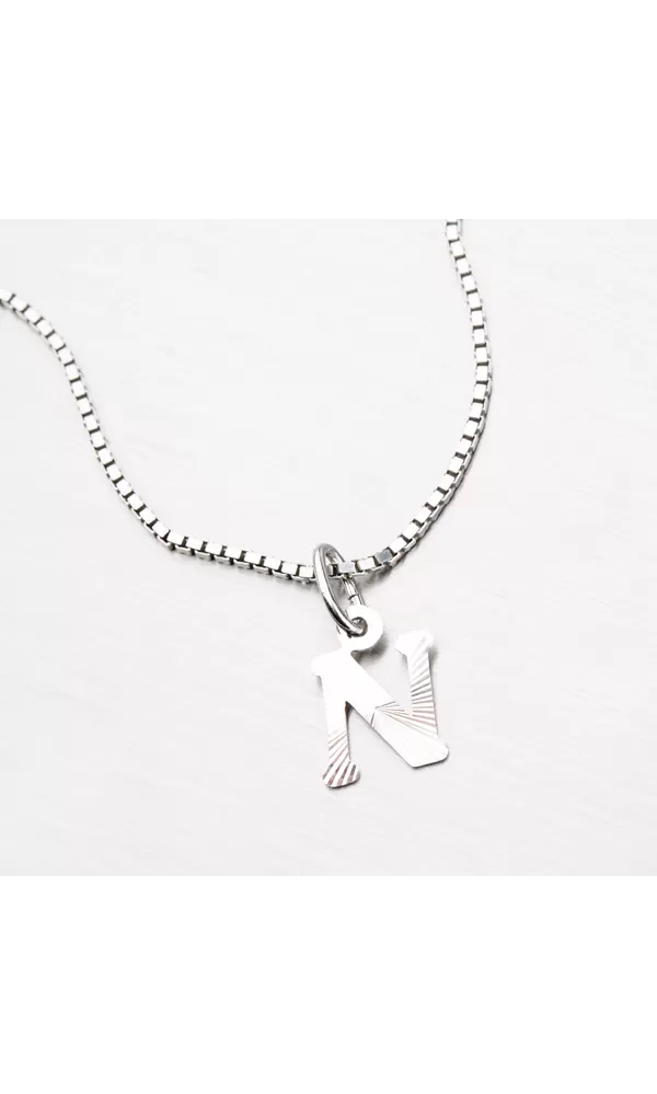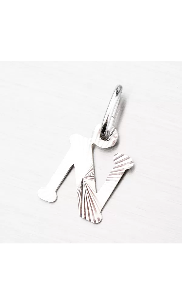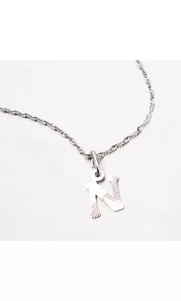 Prívesok v tvare písmenka N je vyrobený z rhodiovaného striebra rýdzosti 925/1000. Ródium je ušľachtilý drahý kov zo skupiny platinových kovov. Rhodiovaním strieborných šperkov galvanickým nanášaním tohto drahého platinového kovu sa stáva povrch šperku tvrdší, stálejší a odolnejší voči vonkajším vplyvom ako je mechanický oter, poškriabanie, nabiehanie striebra, ľudský pot, kozmetické prípravky a ďalšie. Ródium je antialergické. Prívesok je vyrobený v lesklej povrchovej úprave s facetami, ktoré sú robené za pomoci diamantového nástroja a dodávajú šperku maximálny lesk a brilanciu zo všetkých uhlov. K prívesku je vhodné použiť retiazku s priemerom 2,50 mm.