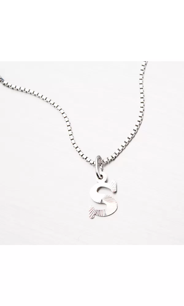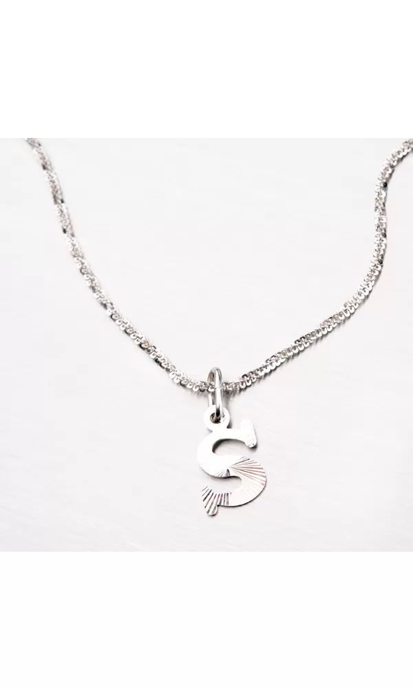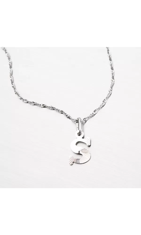 Prívesok v tvare písmenka S je vyrobený z rhodiovaného striebra rýdzosti 925/1000. Ródium je ušľachtilý drahý kov zo skupiny platinových kovov. Rhodiovaním strieborných šperkov galvanickým nanášaním tohto drahého platinového kovu sa stáva povrch šperku tvrdší, stálejší a odolnejší voči vonkajším vplyvom ako je mechanický oter, poškriabanie, nabiehanie striebra, ľudský pot, kozmetické prípravky a ďalšie. Ródium je antialergické. Prívesok je vyrobený v lesklej povrchovej úprave s facetami, ktoré sú robené za pomoci diamantového nástroja a dodávajú šperku maximálny lesk a brilanciu zo všetkých uhlov. K prívesku je vhodné použiť retiazku s priemerom 2,50 mm.