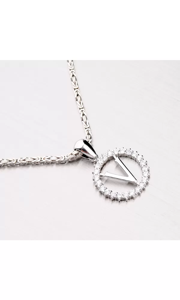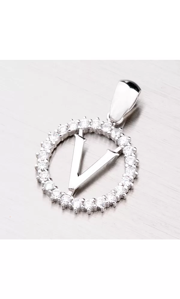 Prívesok v tvare písmenka V je vyrobený z rhodiovaného striebra rýdzosti 925/1000. Prívesok je vyrobený v lesklej povrchovej úprave a je osadený trblietavými zirkónmi. K prívesku je vhodné použiť retiazku s priemerom 2,75 mm.