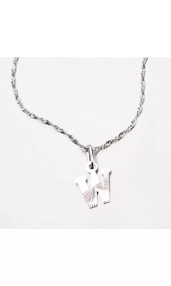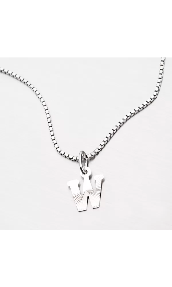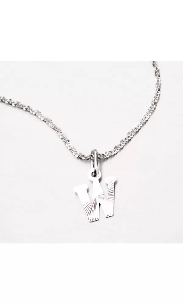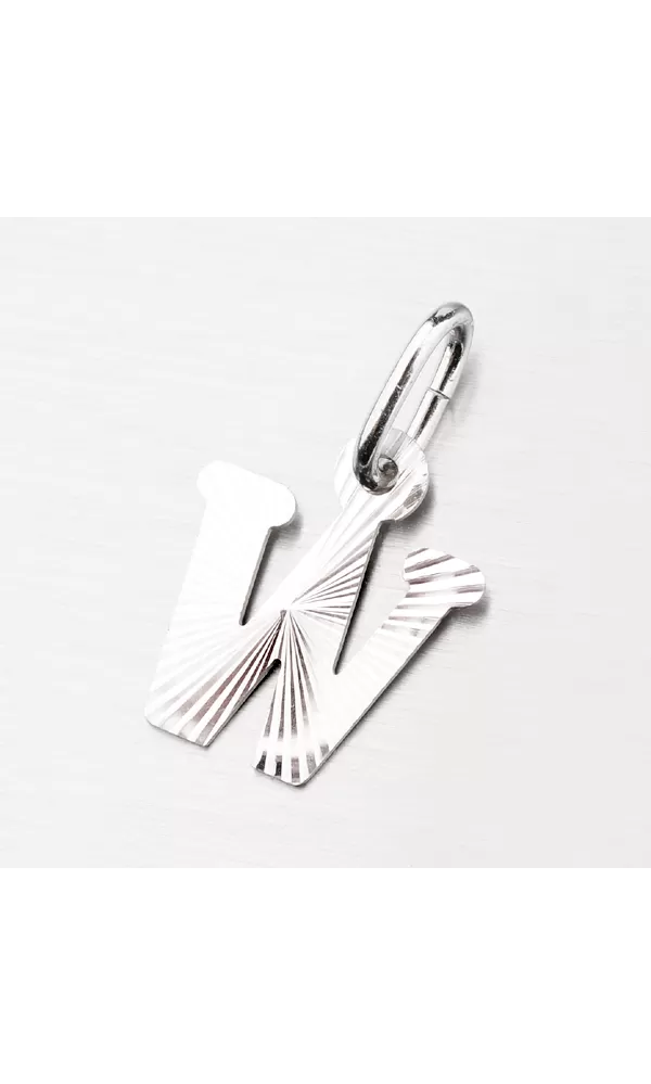 Prívesok v tvare písmenka W je vyrobený z rhodiovaného striebra rýdzosti 925/1000. Ródium je ušľachtilý drahý kov zo skupiny platinových kovov. Rhodiovaním strieborných šperkov galvanickým nanášaním tohto drahého platinového kovu sa stáva povrch šperku tvrdší, stálejší a odolnejší voči vonkajším vplyvom ako je mechanický oter, poškriabanie, nabiehanie striebra, ľudský pot, kozmetické prípravky a ďalšie. Ródium je antialergické. Prívesok je vyrobený v lesklej povrchovej úprave s facetami, ktoré sú robené za pomoci diamantového nástroja a dodávajú šperku maximálny lesk a brilanciu zo všetkých uhlov. K prívesku je vhodné použiť retiazku s priemerom 2,50 mm.