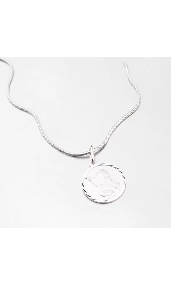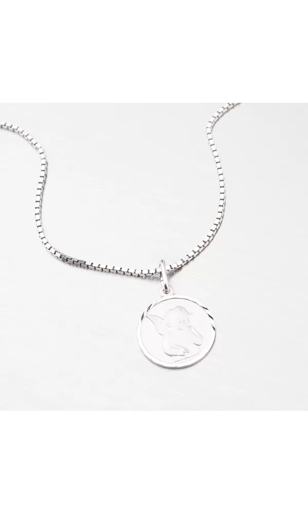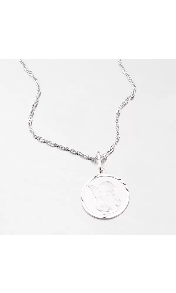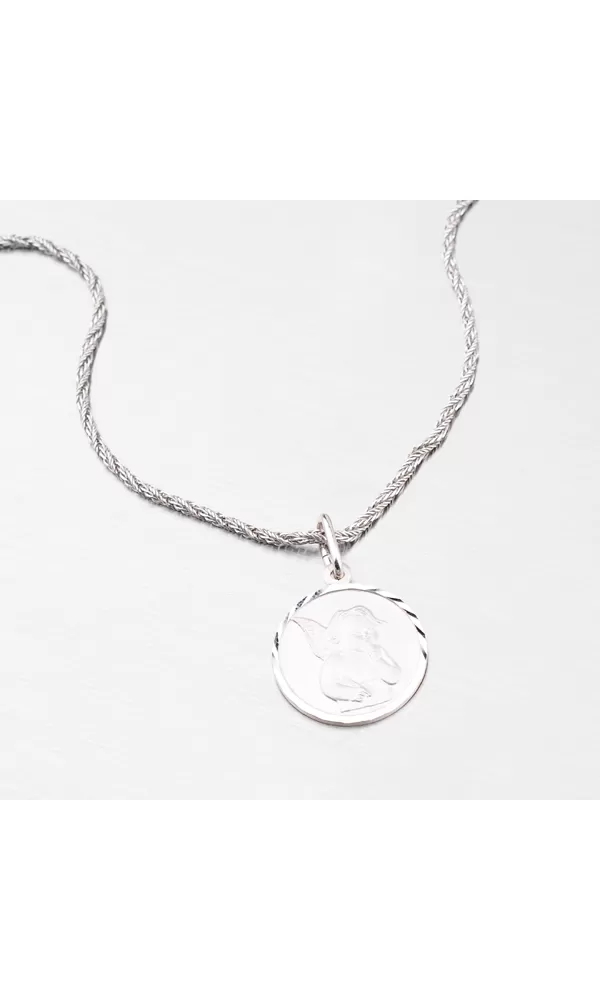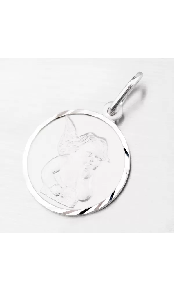 Anjelik - krásny okrúhly prívesok je vyrobený zo striebra rýdzosti 925/1000. Prívesok je vyrobený v kombinácii lesklej a matnej povrchovej úpravy s rhodiovoaním. Na zadnú stranu prívesku je možné vyryť vami vybraný test ako je napr. meno alebo písmeno. Opis rytiny prosím uveďte v kolónke špeciálne požiadavky.