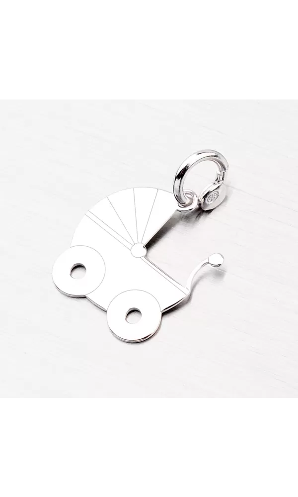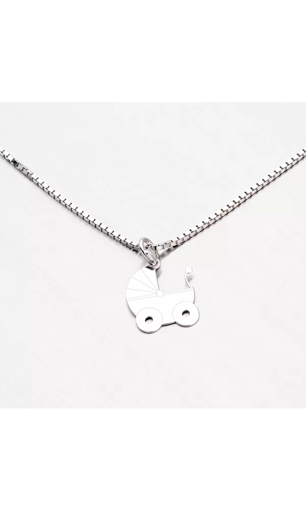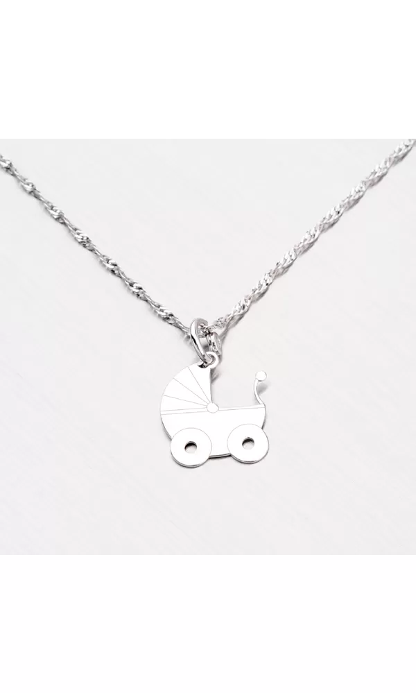 Prívesok v tvare kočíka je skvelý darček k narodeniu dieťaťa. Prívesok je vyrobený zo striebra rýdzosti 925/1000 v lesklej povrchovej úprave a povrch prívesku je zušľachtený rhodiovaním. Ródium je ušľachtilý drahý kov zo skupiny platinových kovov. Rhodiovaním strieborných šperkov galvanickým nanášaním tohto drahého platinového kovu sa stáva povrch šperku tvrdší, stálejší a odolnejší voči vonkajším vplyvom ako je mechanický oter, poškriabanie, nabiehanie striebra, ľudský pot, kozmetické prípravky a ďalšie. Ródium je antialergické.