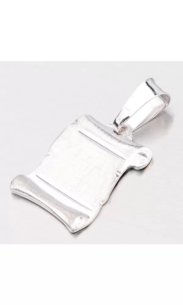 Tento strieborný prívesok v tvare pergamenu vám ozdobíme rytinou podľa vášho priania. Pergamen je vyrobený zo striebra o rýdzosti 925/1000 v matnej a lesklej povrchovej úprave. Rytinu je možné umiestniť z oboch strán prívesku a vyryť si môžete nechať napríklad mená, prezývky alebo napríklad váš spoločný dôležitý dátum. Povrch prívesku je zušľachtený rhodiovaním. Ródium je ušľachtilý drahý kov zo skupiny platinových kovov. Rhodiovaním strieborných šperkov galvanickým nanášaním tohto drahého platinového kovu sa stáva povrch šperku tvrdší, stálejší a odolnejší voči vonkajším vplyvom ako je mechanický oter, poškriabanie, nabiehanie striebra, ľudský pot, kozmetické prípravky a ďalšie. Ródium je antialergické.