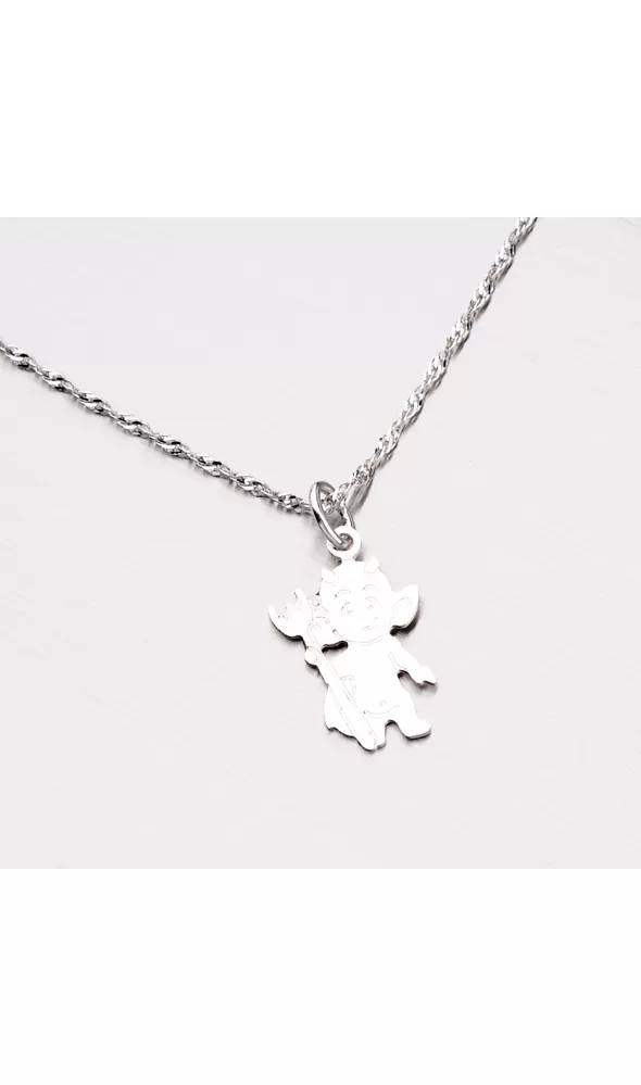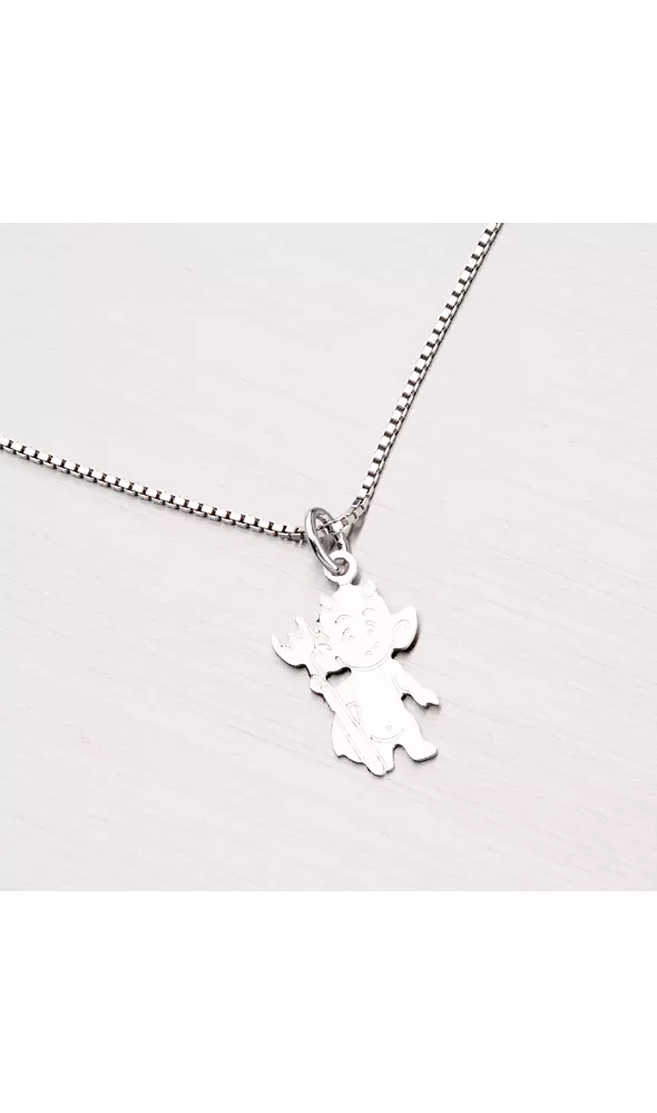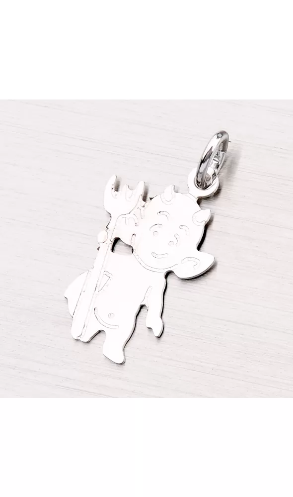 Roztomilý strieborný prívesok v tvare malého čertíka zdobený jemným ryhovaním.