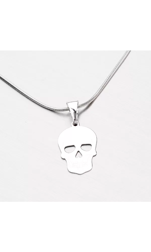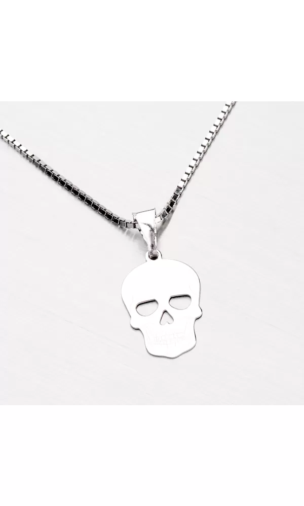 Strieborný príspevok v tvare lebky v lesklej povrchovej úprave.Tento prívesok je ideálny s rytinou, ktorú môžete dať na zadnú stranu prívesku.… Celý popis