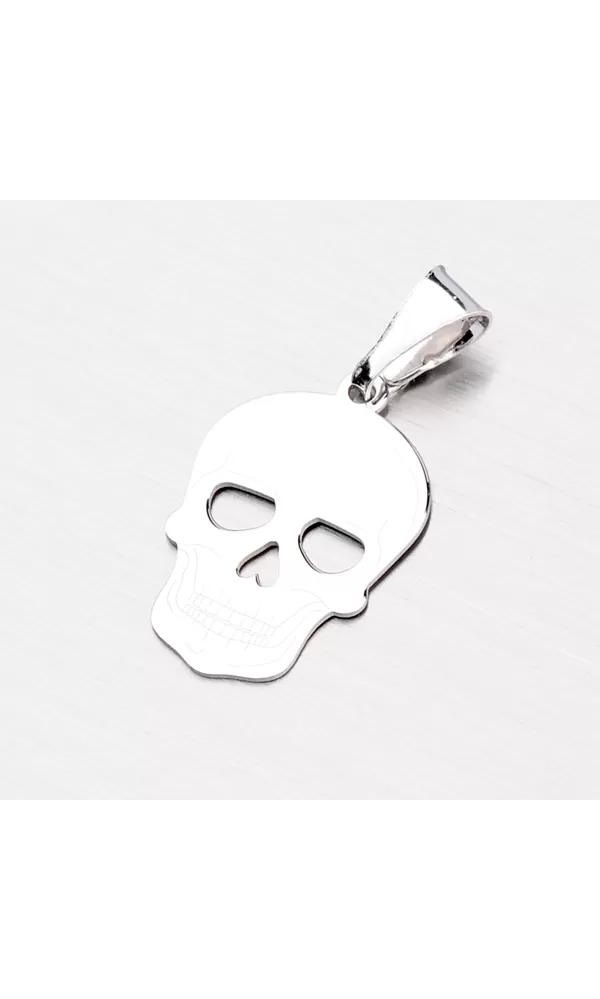 Strieborný príspevok v tvare lebky v lesklej povrchovej úprave.Tento prívesok je ideálny s rytinou, ktorú môžete dať na zadnú stranu prívesku. monogram, iniciály, venovanie. kolónke špeciálne požiadavky.