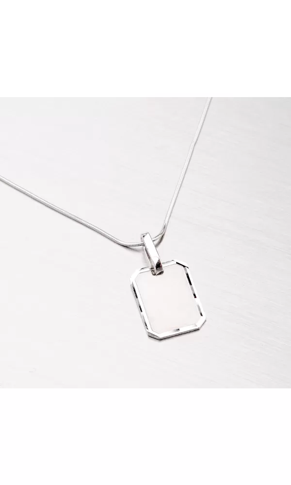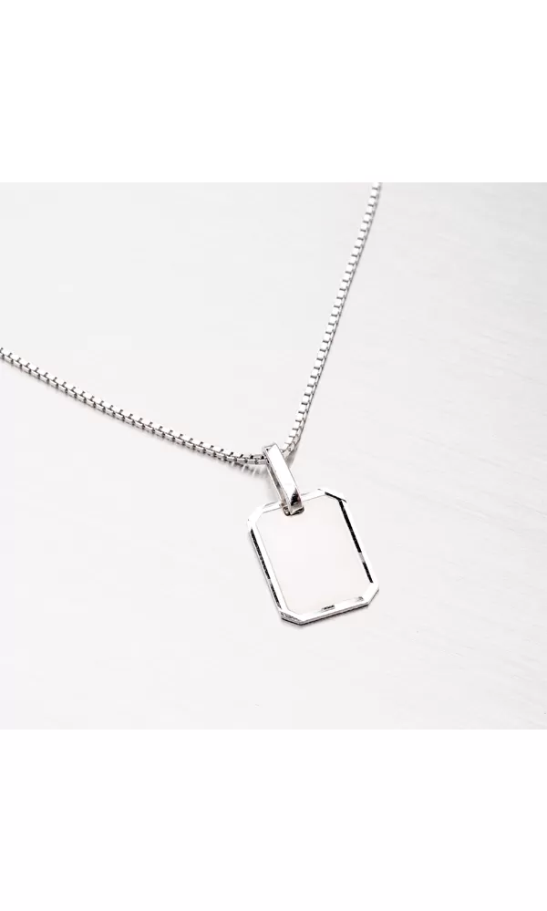 Strieborný prívesok v tvare doštičky. Doštička má väčšiu časť matovanú, presnejšie pieskovanú. Kraje doštičky sú zdobené lesklými facetami, ktoré sú zhotovené diamantovým nástrojom, ktorý zaisťuje maximálny lesk.