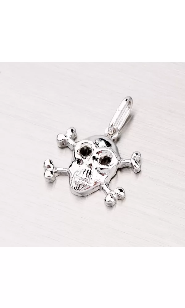 Pirátsky prívesok v tvare lebky je vyrobený z rhodiovaného striebra rýdzosti 925/1000 v lesklej povrchovej úprave.