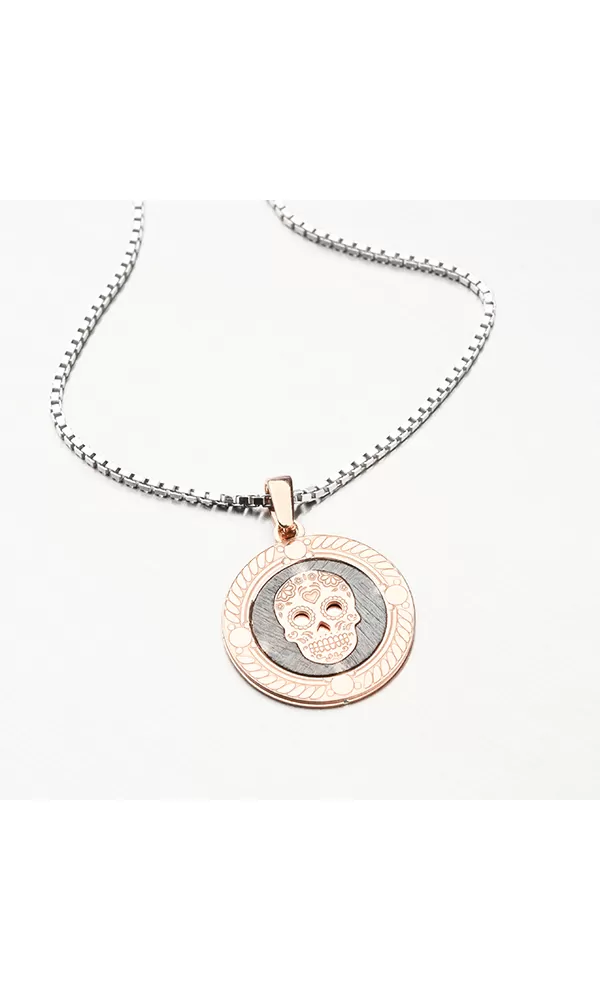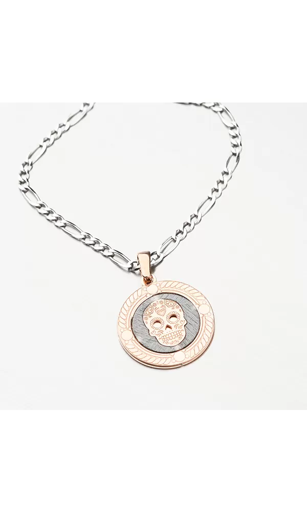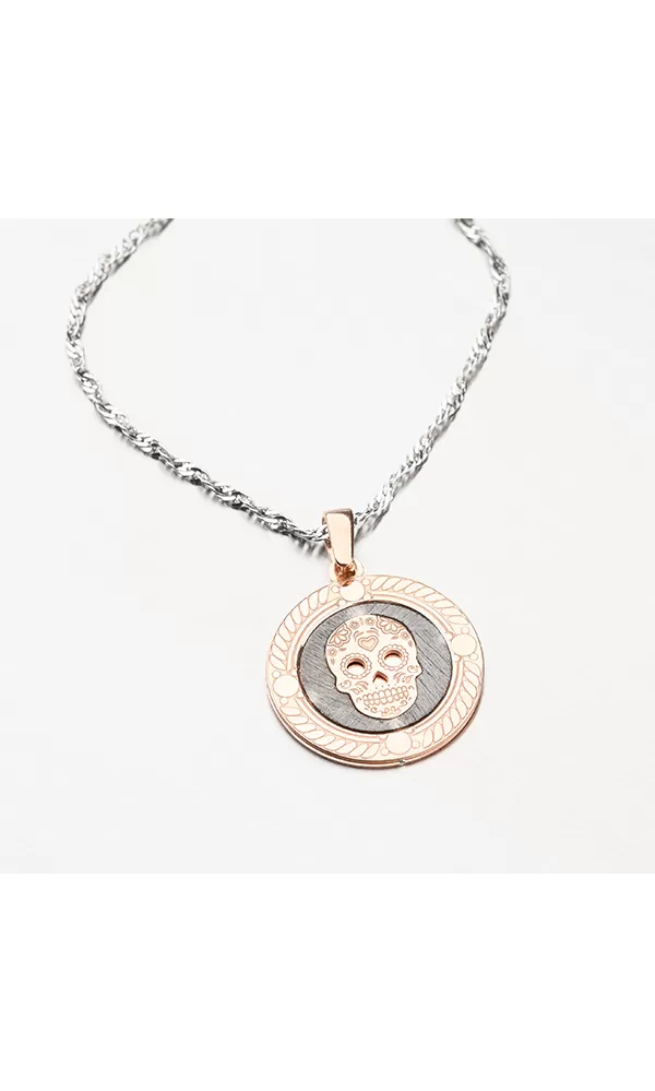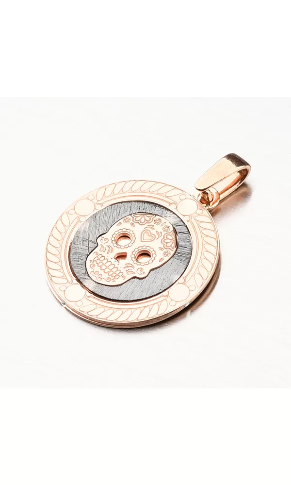 Originálny prívesok so symbolom lebky. Prívesok je okrúhly av strede má vyobrazenú lebku. Potom okolo nej je povrch pozlátený technikou PVD vo farbe ružového zlata. Prednosťou zlatenia technológií PVD je vysoká tvrdosť a odolnosť proti oteru! Ide o hrubú vrstvu, ktorá preniká do pôvodného materiálu. Zlatenie technológií PVD sa dá porovnať s približne 6 mikrónmi galvanického zlatenia, čo je vysoká hodnota, ktorá pri bežnom nosení vydrží až niekoľko rokov.
