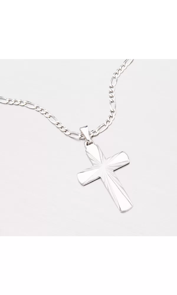 Tento prívesok v tvare kríža je vyrobený zo striebra s rýdzosťou 925/1000 v lesklej povrchovej úprave okrem matných lúčov, ktoré vedú od prostriedku kríža smerom von. Povrch prívesku je zušľachtený rhodiovaním. Ródium je ušľachtilý drahý kov zo skupiny platinových kovov. Rhodiovaním strieborných šperkov galvanickým nanášaním tohto drahého platinového kovu sa stáva povrch šperku tvrdší, stálejší a odolnejší voči vonkajším vplyvom ako je mechanický oter, poškriabanie, nabiehanie striebra, ľudský pot, kozmetické prípravky a ďalšie. Ródium je antialergické.