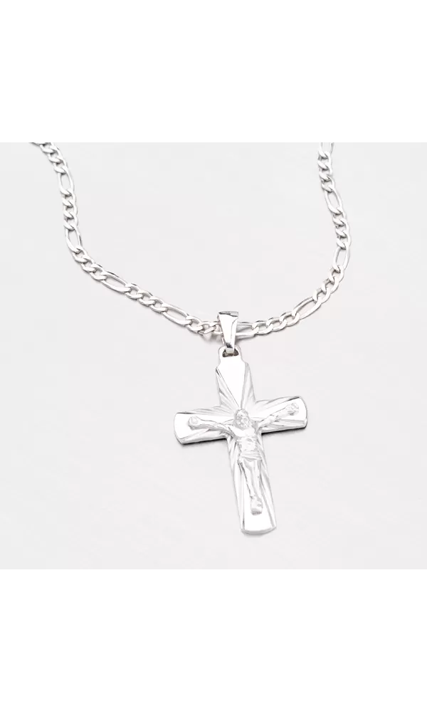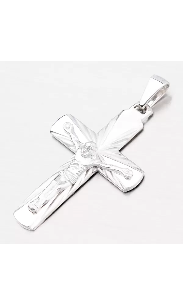 Tento prívesok kríž je vyrobený zo striebra rýdzosti 925/1000 s lesklým povrchom, s výnimkou matných lúčov, ktoré vychádzajú zo stredu kríža smerom von. Kríž je tiež modelovaný s Ježišom, ktorý je ukrižovaný na kríži. Povrch prívesku je zušľachtený rhodiovaním. Ródium je ušľachtilý drahý kov zo skupiny platinových kovov. Rhodiovaním strieborných šperkov prostredníctvom galvanického nanášania tohto drahého platinového kovu sa povrch šperku stáva tvrdším, trvácnejším a odolnejším voči vonkajším vplyvom ako je mechanické otery, poškriabanie, zatekanie striebra, ľudský pot, kozmetické prípravky a iné. Rhodium je antialergické.