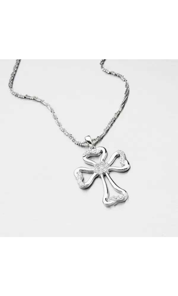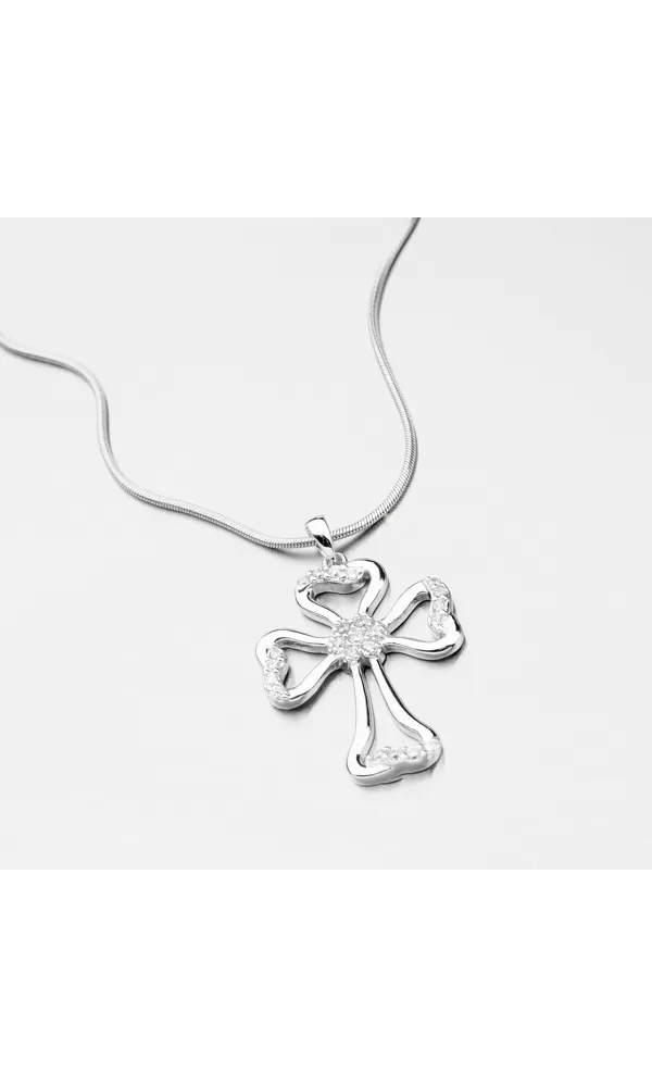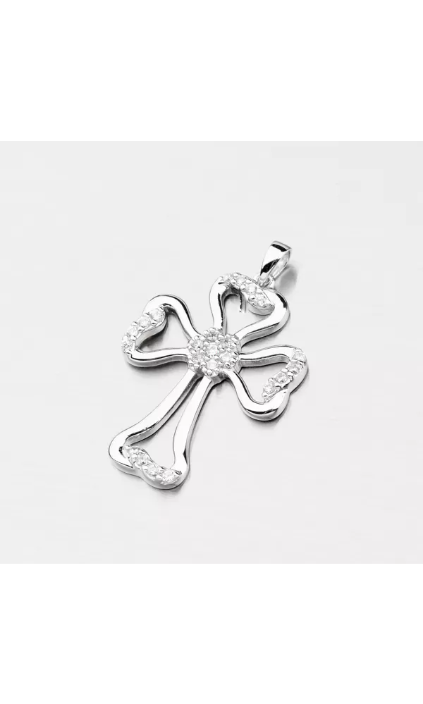 Kríž má oblé hrany a zdobený je žiarivými zirkónmi v briliantovom bruse. K prívesku je vhodné použiť retiazku o max. priemere 2,50 mm. Na doplňujúcich fotkách sú retiazky pod označením Chrs-rock-030, Mgc-rnd-030, VEGD-022R-Rh.