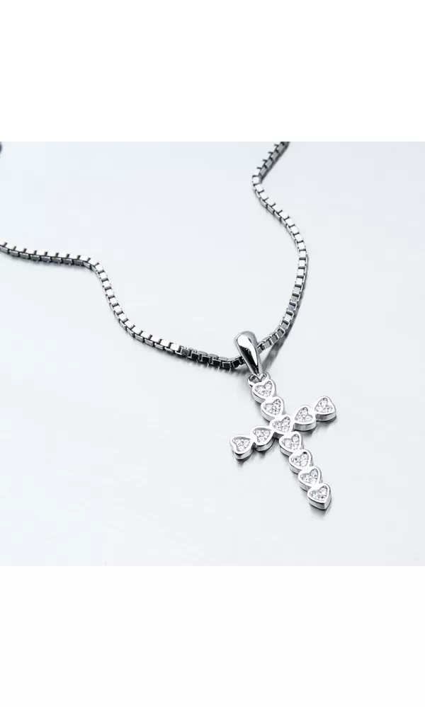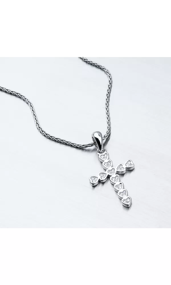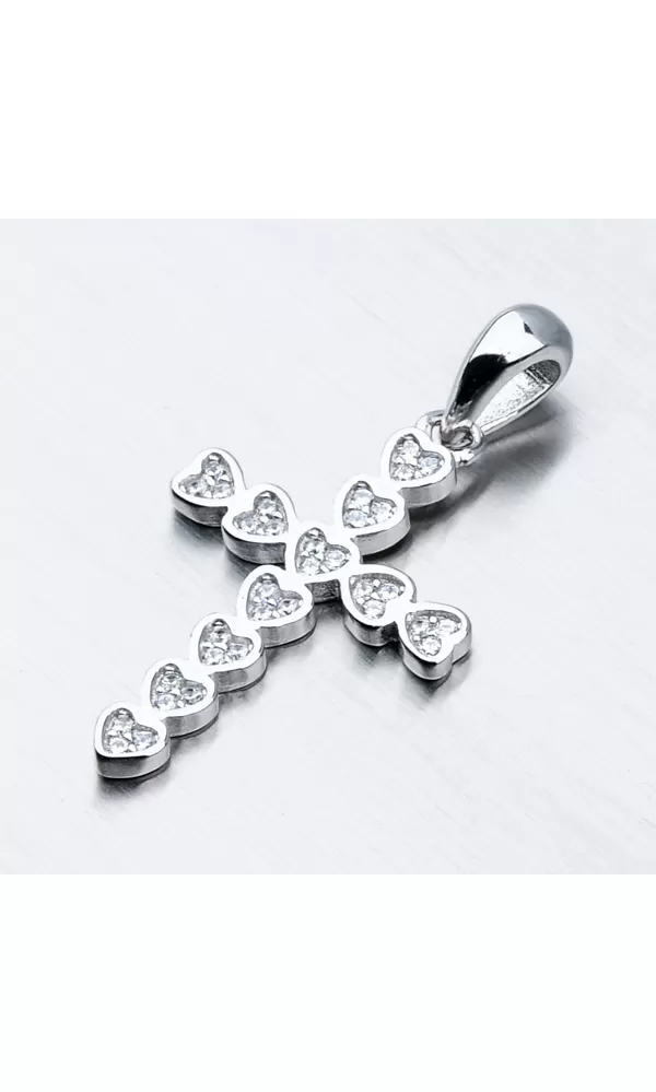 Veľmi zaujímavé prevedenie tohto prívesku v tvare kríža vás upúta na prvý pohľad. Krížik je tvorený z pospájaných srdiečok do ktorých sú starostlivo vsadené zirkóny v briliantovom bruse. Zaujmite týmto prekrásnym šperkom.
