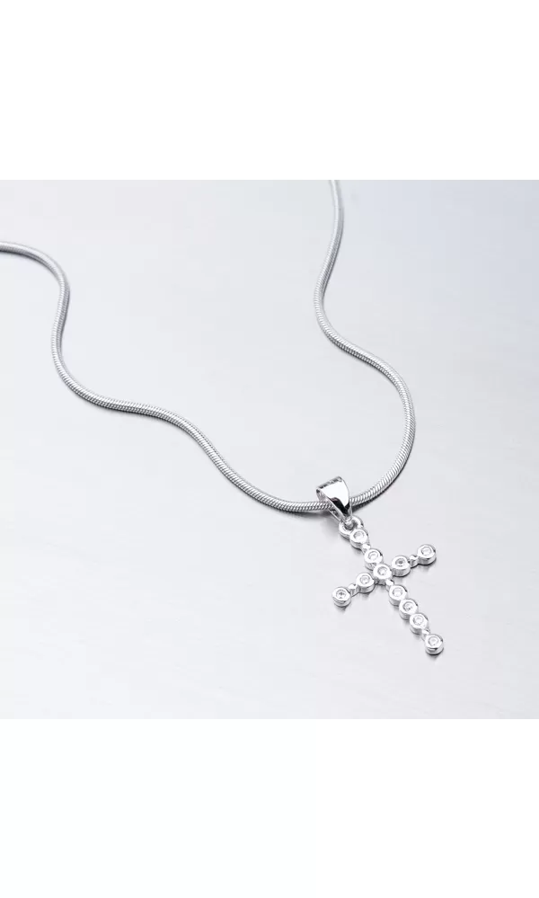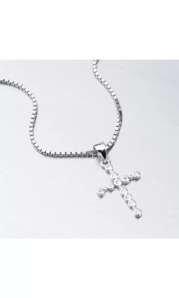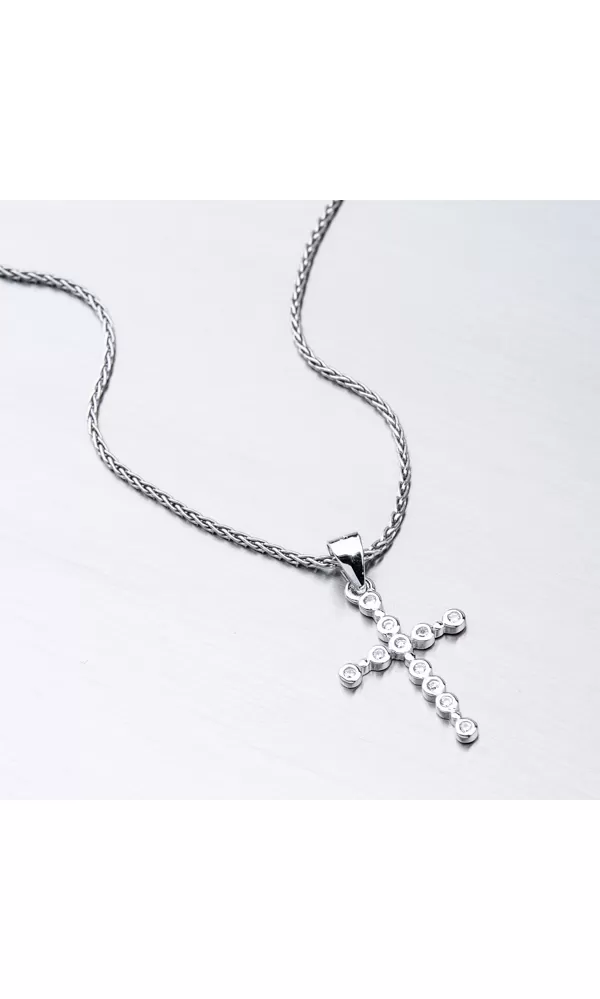 Veľmi zaujímavé prevedenie tohto prívesku v tvare kríža vás upúta na prvý pohľad. Krížik je tvorený z pospájaných krúžkov, do ktorých sú starostlivo vsadené zirkóny v briliantovom bruse. Zaujmite týmto prekrásnym šperkom.