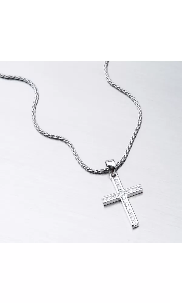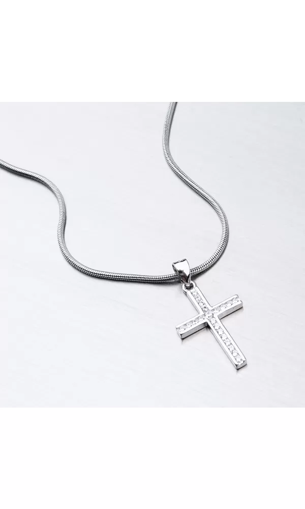 Klasický kríž, ktorý patrí medzi najobľúbenejšie prívesky je zvýraznený zirkónmi, ktoré sú precízne vsadené jeden vedľa druhého. Zirkóny sú v briliantovom bruse, ktorý dodáva zirkónom brilanciu pravých diamantov.