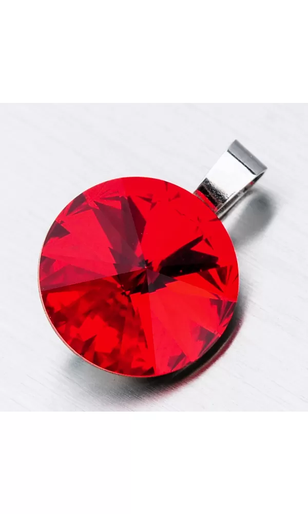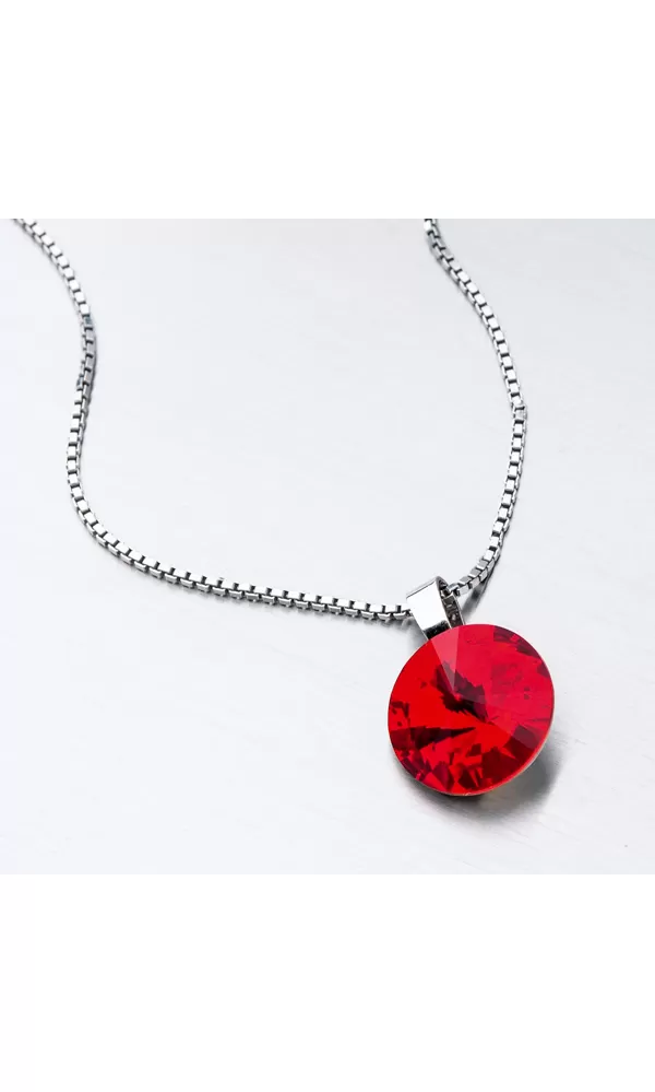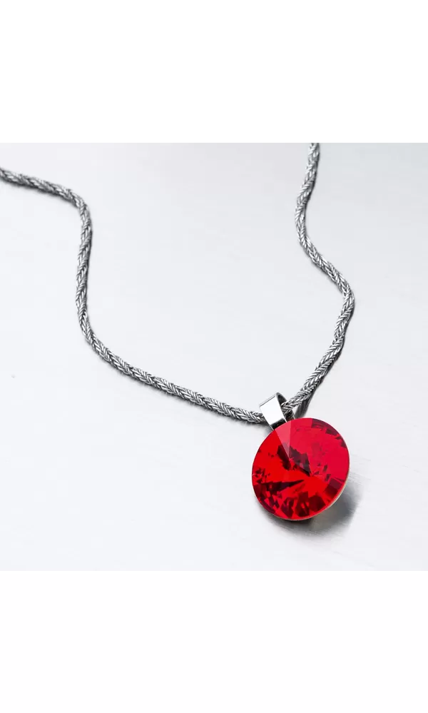 Túžite po žiarivom šperku, ktorý vám rozžiari dekolt? Tento prívesok je v jednoduchom dizajne ale zdobí ho extravagantný kryštál v červenej farbe precízne brúsený tak, aby dokonale odrážal svetlo. Buďte hravá a podporte prívesok a zlaďte ho s vašim outfitom. K tomuto prívesku je hodná retiazka o šírke 2,50 mm.
