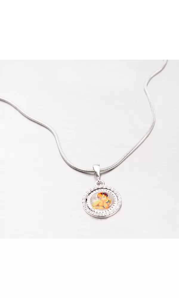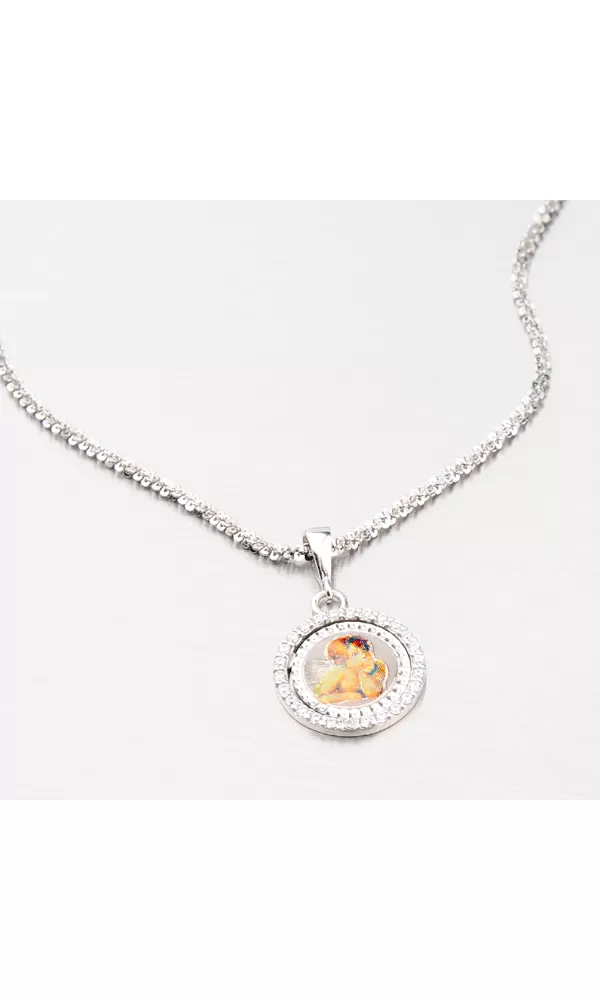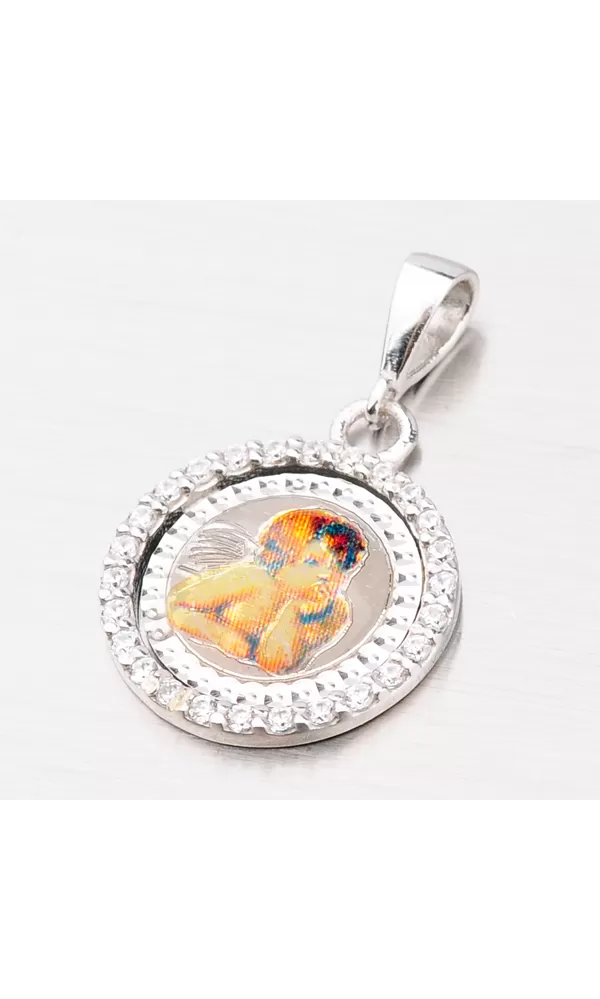 Hľadáte decentný prívesok zo striebra, ktorý letmo ozdobí váš krk? Tento okrúhly prívesok je vyrobený zo striebra o rýdzosti 925/1000 a je zdobený anjelikom, ktorý si podopiera hlavu. Okrúhly rám prívesku je osadený 26 zirkónmi. Povrch prívesku je zušľachtený rhodiovaním. Ródium je ušľachtilý drahý kov zo skupiny platinových kovov. Rhodiovaním strieborných šperkov galvanickým nanášaním tohto drahého platinového kovu sa stáva povrch šperku tvrdší, stálejší a odolnejší voči vonkajším vplyvom ako je mechanický oter, poškriabanie, nabiehanie striebra, ľudský pot, kozmetické prípravky a ďalšie. Ródium je antialergické.