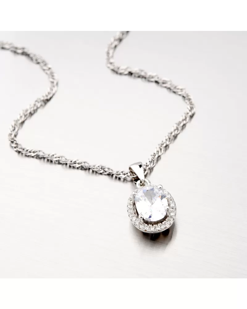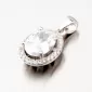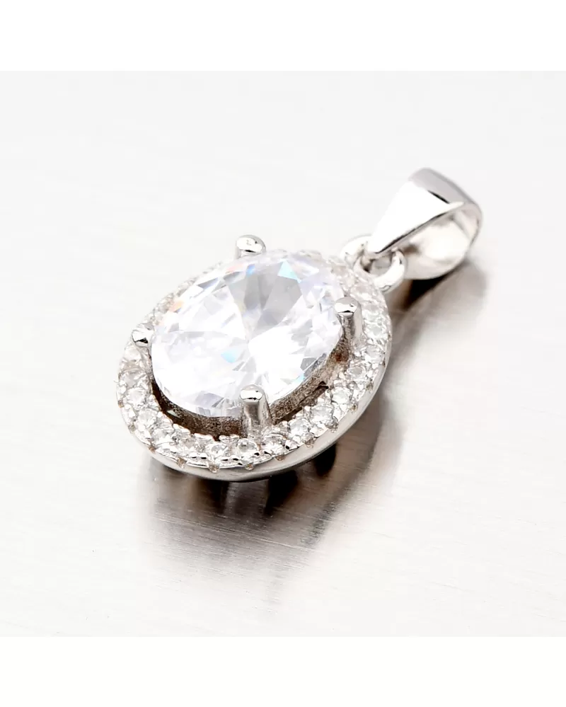 Elegantný prívesok v oválnom tvare zdobí veľký zirkón v briliantovom bruse a okolo neho sú vsadené menšie zirkóny.