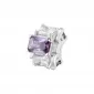 Originálny prívesok s prievlakom je zdobený precízne brúsenými kubickými zirkónmi v kombinácii bielej a fialovej farbe. Šperk je vyrobený z rhodiovaného striebra rýdzosti 925/1000. Ródium je ušľachtilý drahý kov zo skupiny platinových kovov. Rhodiovaním strieborných prsteňov galvanickým nanášaním tohto drahého kovu sa stáva povrch šperku tvrdší, stálejší a odolnejší voči vonkajším vplyvom ako je mechanický oter, poškriabanie, nabiehanie striebra, ľudský pot, kozmetické prípravky a ďalšie. Ródium je antialergické. Prívesok je možné umiestniť na retiazku alebo náramok a vytvoriť tak osobitý šperk.