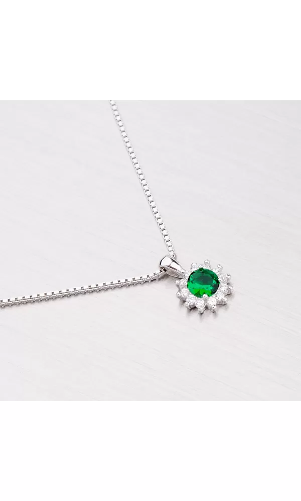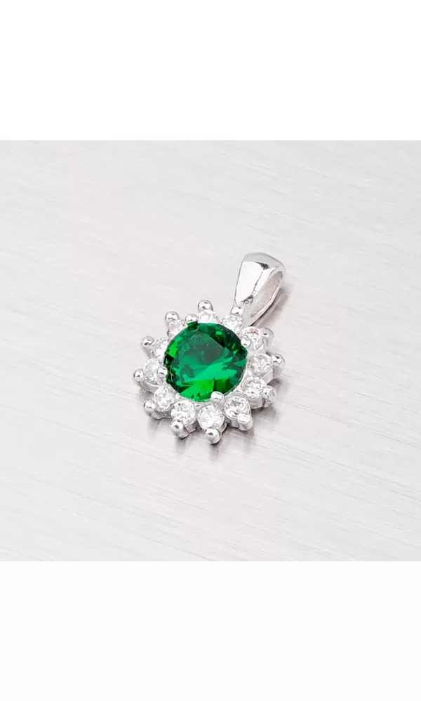Tento rhodiovaný žiarivý prívesok Vás oslní. Je vyrobený zo striebra rýdzosti 925/1000 v lesklej povrchovej úprave. Prívesok zdobí zelený kamienok, ktorý je dookola vysadený trblietavými drobnými zirkónmi. K prívesku je vhodné použiť retiazku s priemerom 2 mm.
