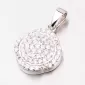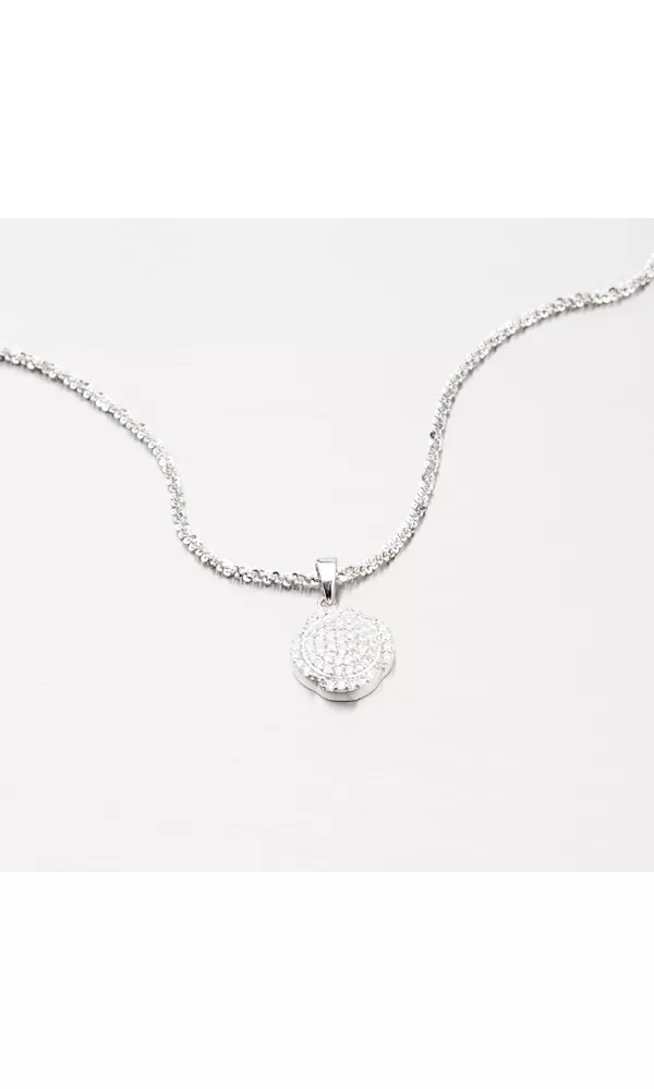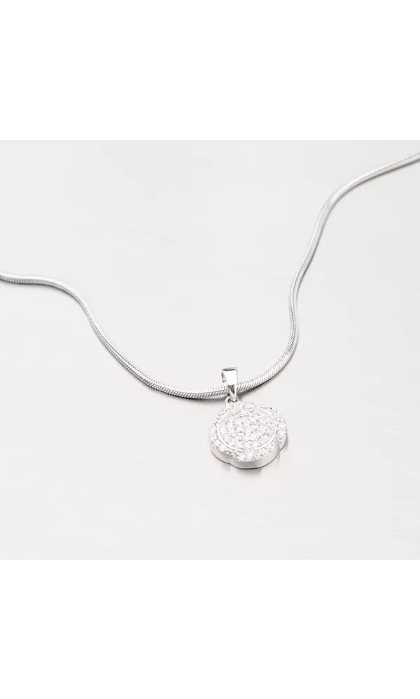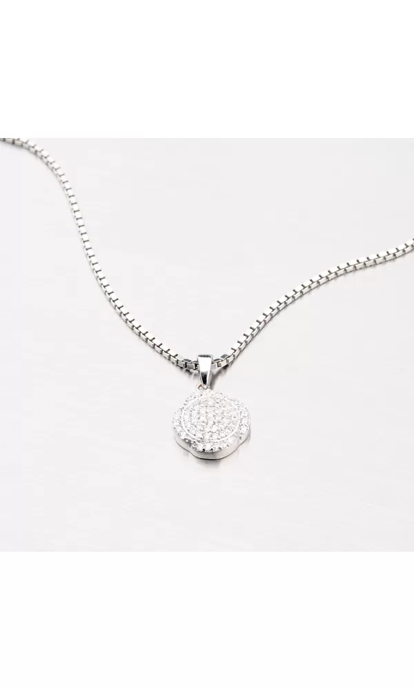 Okrúhly prívesok je vyrobený zo striebra s rýdzosťou 925/1000 s povrchovým zušľachtením rhodiovaním v lesklej povrchovej úprave. Je ozdobený bielymi zirkónmi, ktoré sú do šperky zasadené technikou microsetting. K tomuto prívesku je vhodné použiť retiazku s maximálnym priemerom 2,25 mm.