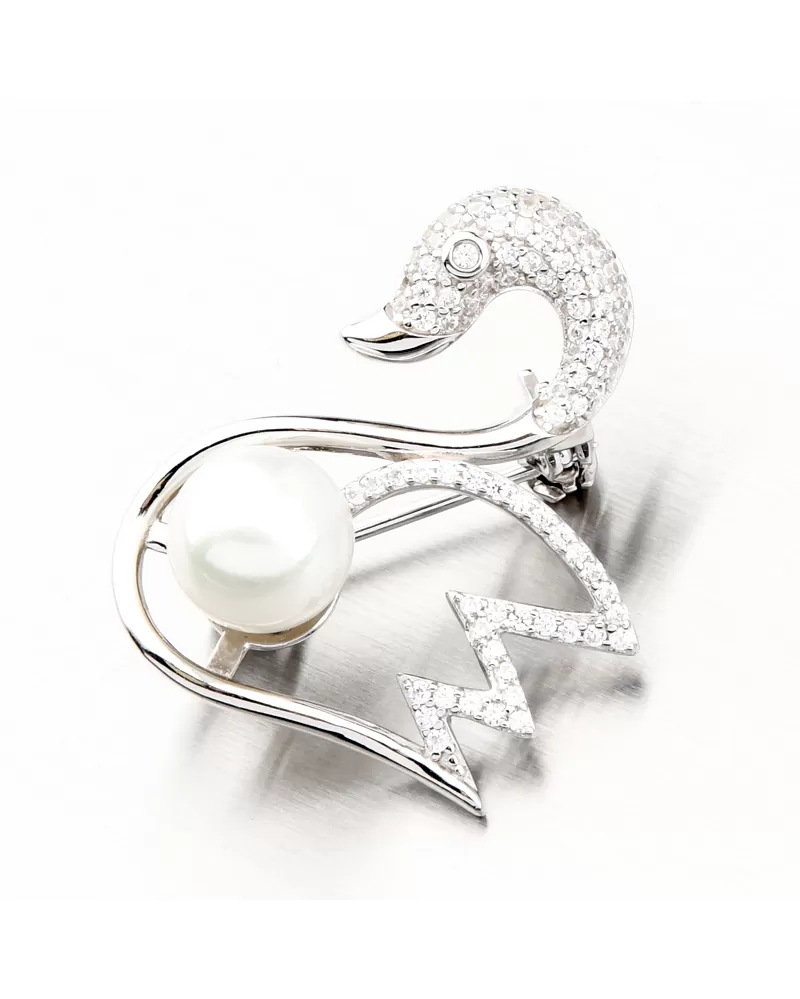 Nádherná brošňa v tvare labute osadená žiarivými zirkónmi av spodnej časti syntetickou perlou v bielej farbe. Brošňa rozhodne nepatrí len do výbavy našich babičiek, je totiž veľmi obľúbeným šperkom súčasnej doby. Tento šperk je povinnou výbavou šperkovnice mladých aj starších manažérok, ale aj žien, ktoré sa jednoducho len rady páčia. Zirkóny v tejto brošni sú v briliantovom bruse. Zirkóny vďaka tomuto brúsu vytvárajú oslnivú brilanciu.