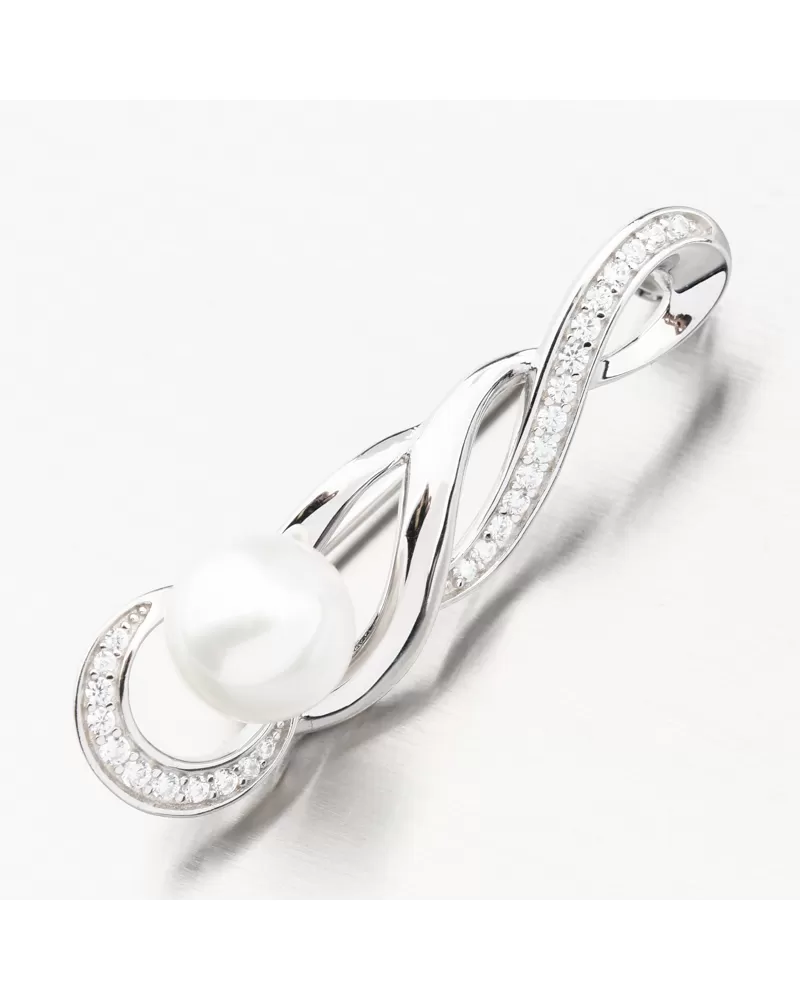 Nádherná brošňa prepleteného tvaru osadená žiarivými zirkónmi av spodnej časti syntetickou perlou v bielej farbe. Brošňa rozhodne nepatrí len do výbavy našich babičiek, je totiž veľmi obľúbeným šperkom súčasnej doby. Tento šperk je povinnou výbavou šperkovnice mladých aj starších manažérok, ale aj žien, ktoré sa jednoducho len rady páčia. Zirkóny v tejto brošni sú v briliantovom bruse. Zirkóny vďaka tomuto brúsu vytvárajú oslnivú brilanciu.