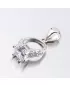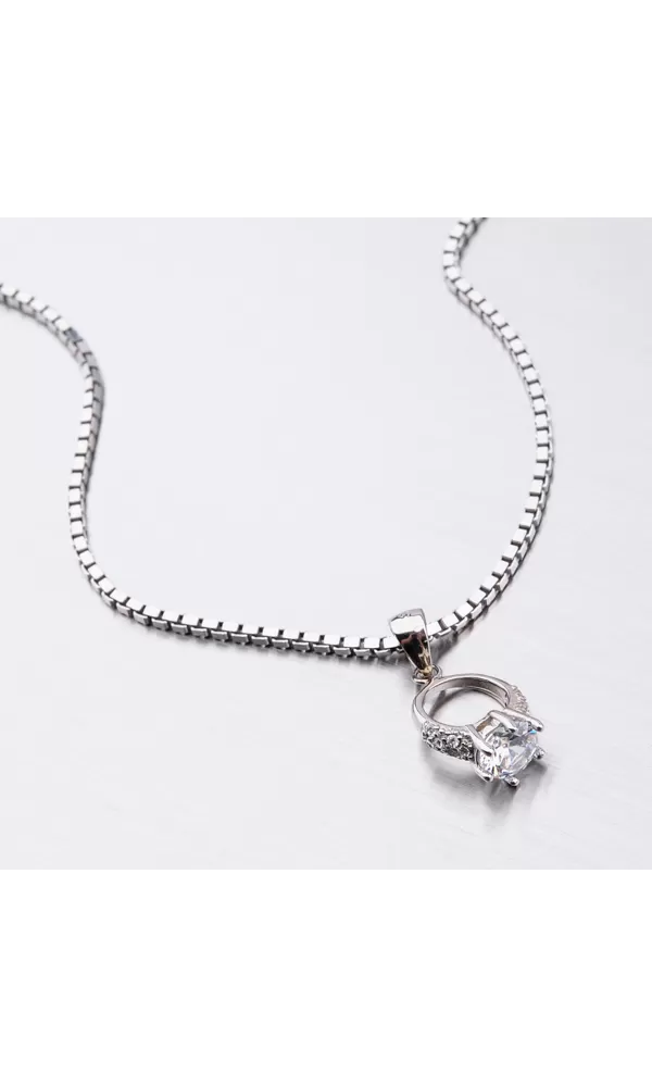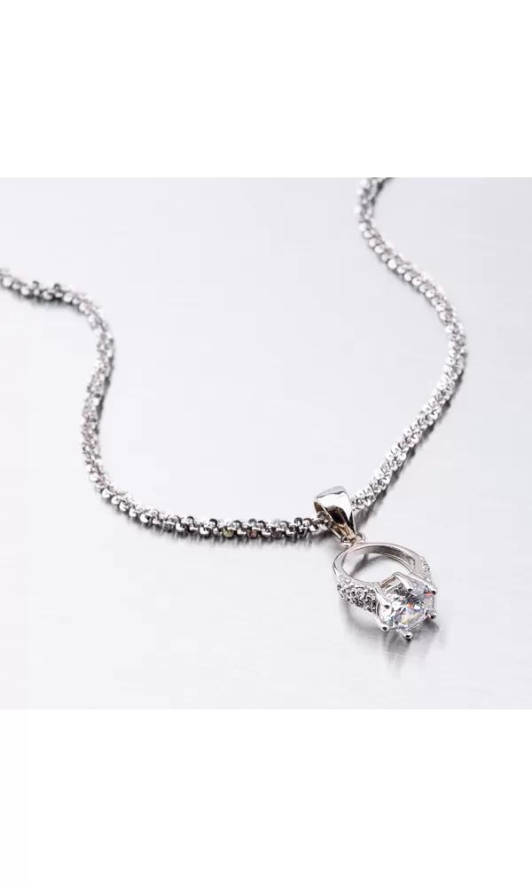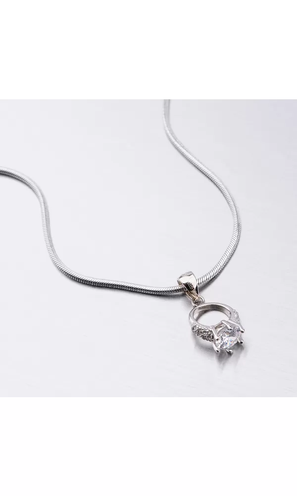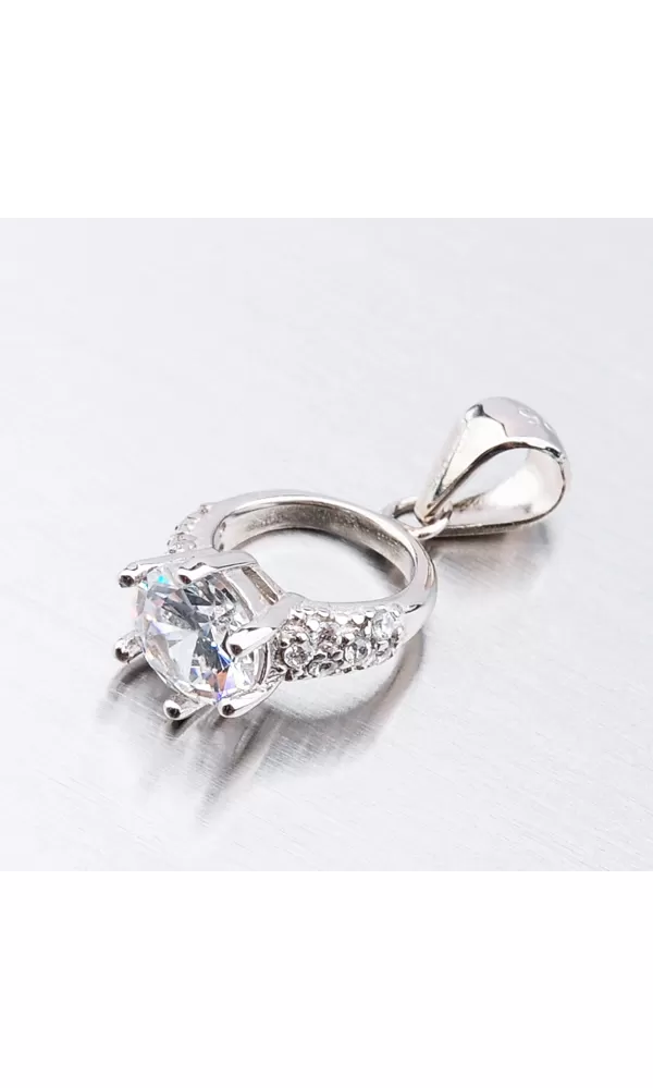 Originálny prívesok v tvare prstienka je zdobený hlavným zirkónom, ktorý je vsadený uprostred a menšími zirkónmi, ktoré sú vsadené na obrúčke prsteňa. Zirkóny sú brúsené do briliantového brusu, ktorý zaručuje neodolateľný lesk kameňov. Prívesok je vyrobený zo striebra o rýdzosti 925/1000 v lesklej povrchovej úprave a povrch prívesku je zušľachtený rhodiovaním. Ródium je ušľachtilý drahý kov zo skupiny platinových kovov. Rhodiovaním strieborných šperkov galvanickým nanášaním tohto drahého platinového kovu sa stáva povrch šperku tvrdší, stálejší a odolnejší voči vonkajším vplyvom ako je mechanický oter, poškriabanie, nabiehanie striebra, ľudský pot, prípravky a ďalšie. Ródium je antialergické.