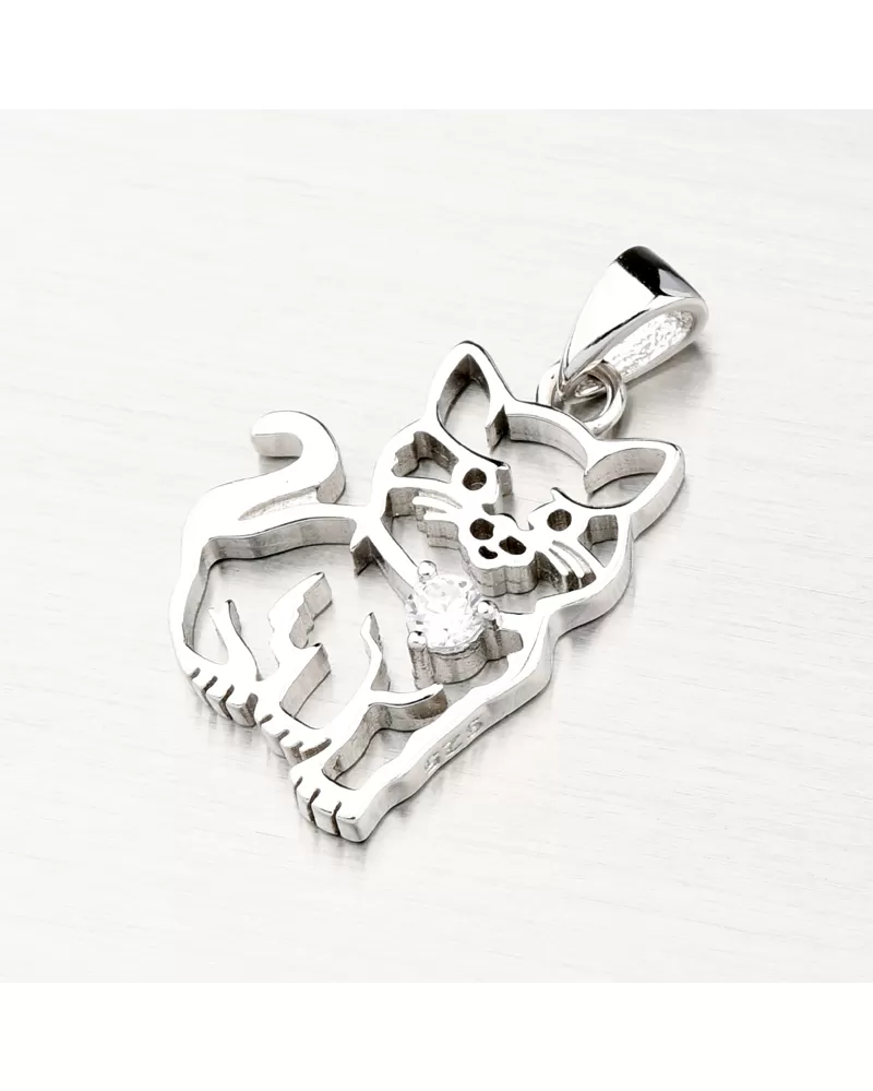 Roztomilý strieborný prívesok s motívom mačičky. Prívesok je tvorený z obrysu celej postavy mačičky aj s fúzkami. Mačička má na mieste obojku osadený zirkón briliantového brusu. Tento brús zaisťuje maximálnu brilanciu vybrúsených facet, dokonale odráža svetlo a neuveriteľne žiari z každého uhla pohľadu.