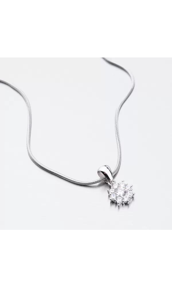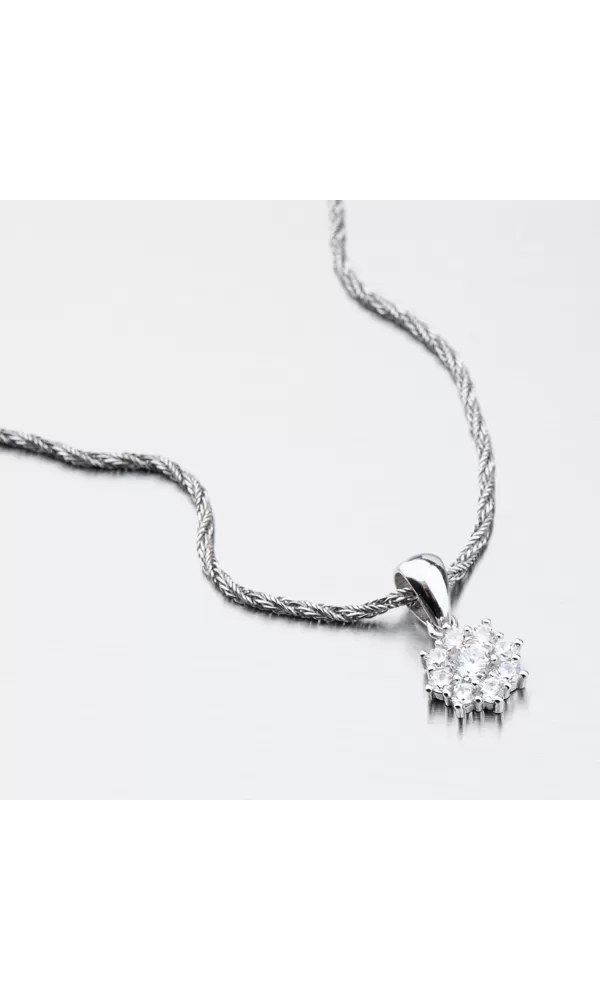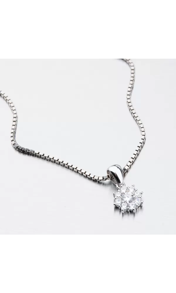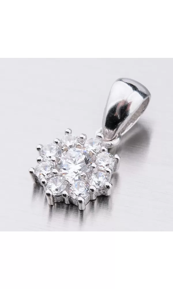 Decentný prívesok vám dokonale ozdobí dekolt. Prívesok zdobia zirkóny, ktoré sú vsadené do tvaru kvety. Uprostred prívesku je vsadený väčší zirkón a okolo neho je vsadených osem menších zirkónov. Zirkóny sú precízne brúsené do briliantového brúsu.