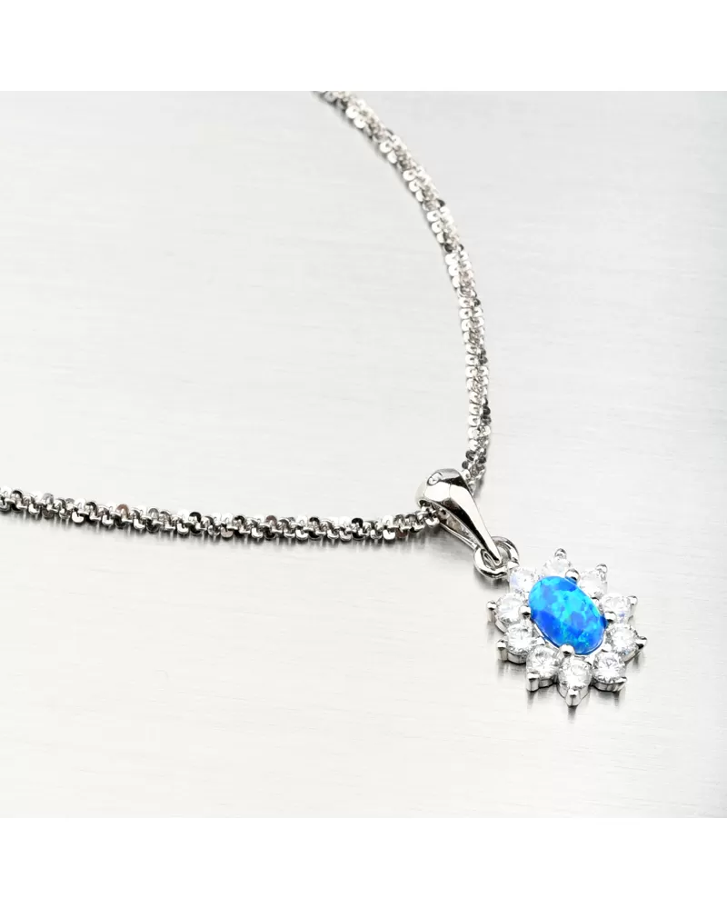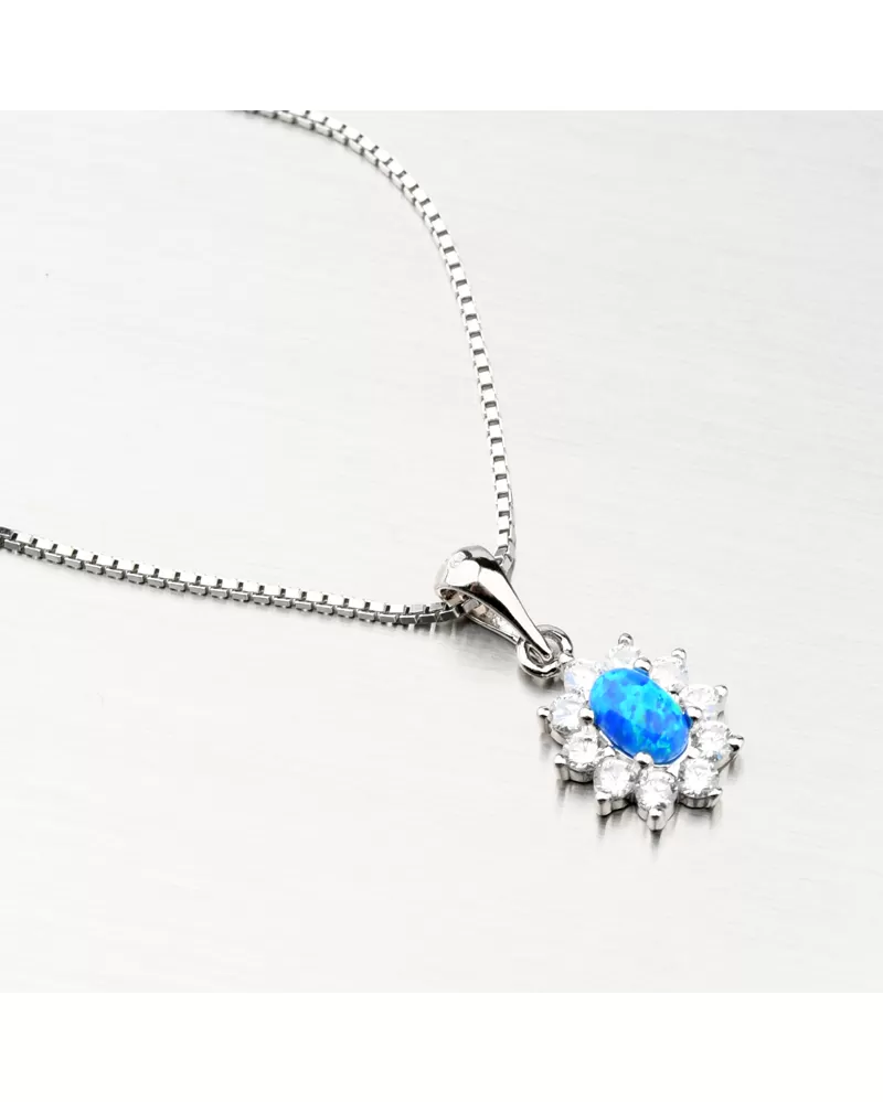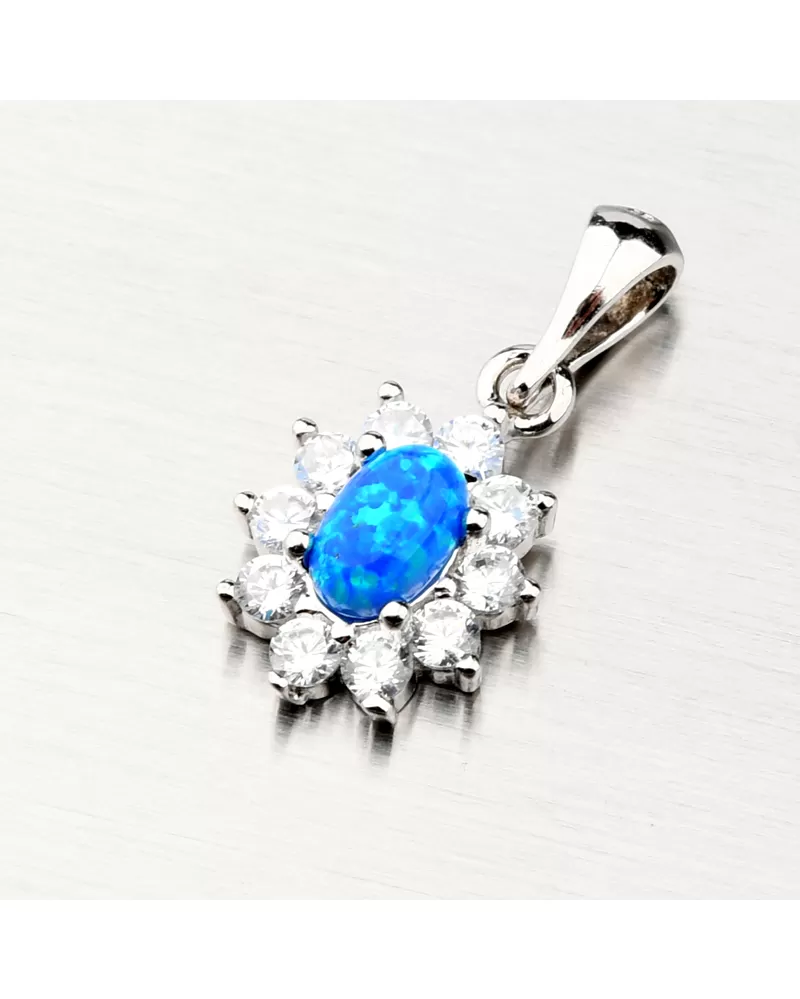 Šperky s opálmi zaujmú okolie na prvý pohľad. Modrý opál je preslávený svojimi žiarivými odleskami a krásnou farbou, ktorá dokonale vyladí Váš outfit. Opál je syntetický a je vo oválneho tvaru a okolo neho sú drobné zirkóny vybrúsené do okrúhleho briliantového brusu, ktorý zaisťuje maximálnu brilanciu vybrúsených facet, dokonale odráža svetlo a neuveriteľne žiari z každého uhla pohľadu. Prívesok je veľmi ľahký a bude maximálne pohodlný na celodenné nosenie.