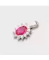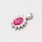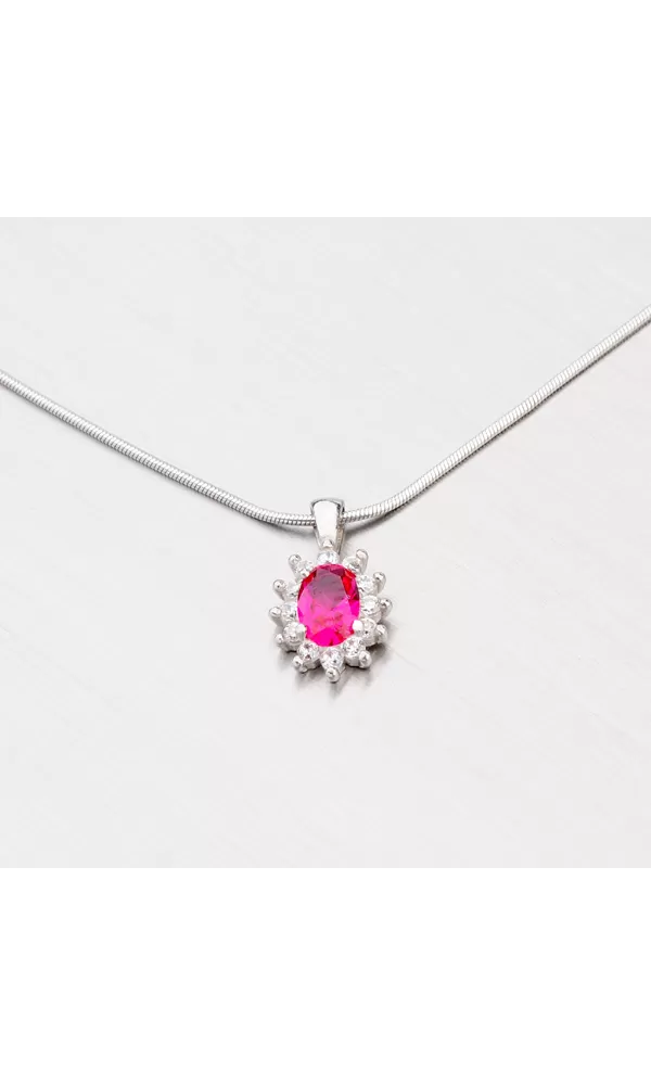 Elegantný dámsky prívesok zaujme žiarivými zirkónmi, ktoré sú vsadené po celom prívesku. Hlavný kameň je oválneho tvaru a jedná sa o syntetický rubín. Okolo neho sú vsadené drobnejšie zirkóny v bielej farbe.