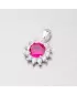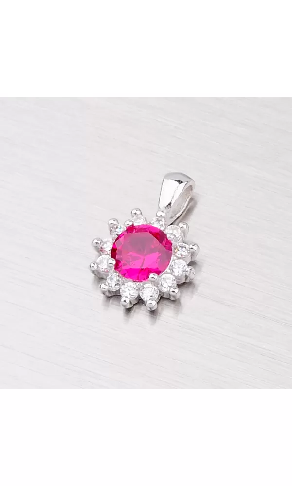 Tento rhodiovaný žiarivý prívesok Vás oslní. Je vyrobený zo striebra rýdzosti 925/1000 v lesklej povrchovej úprave. Prívesok je zo syntetického rubínu, ktorý je dookola vysadený trblietavými drobnými zirkónmi. K prívesku je vhodné použiť retiazku s priemerom 2 mm.