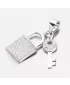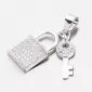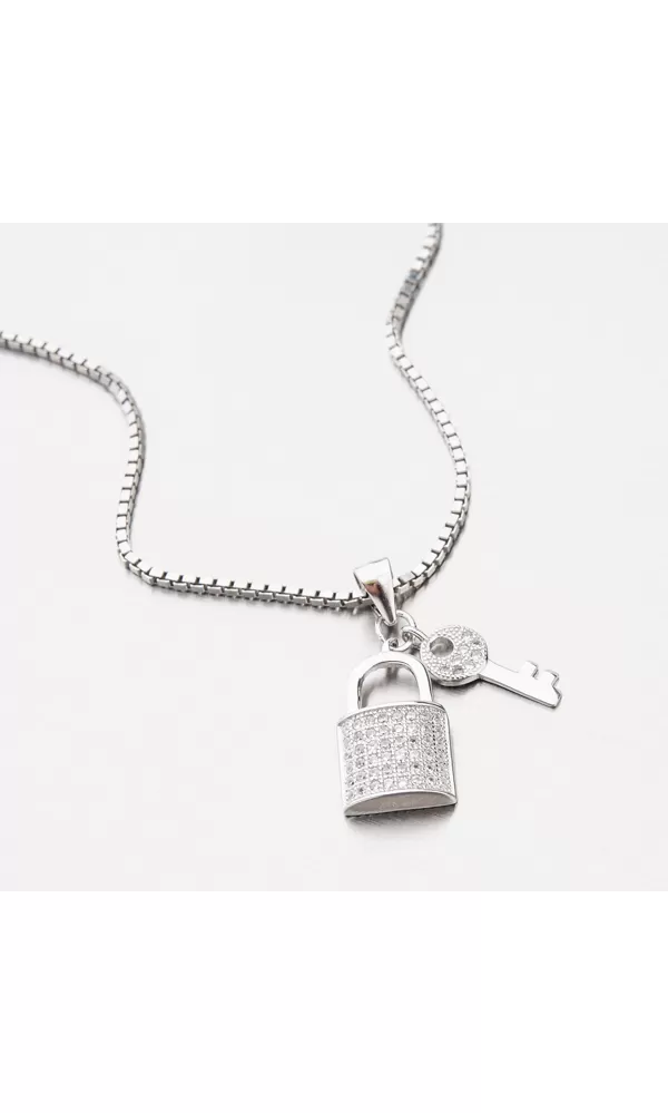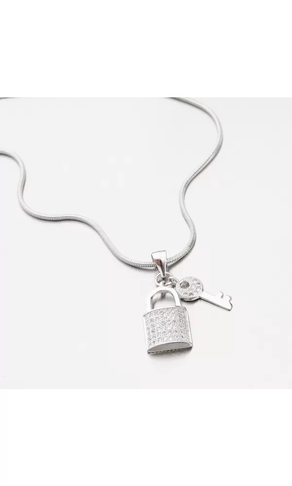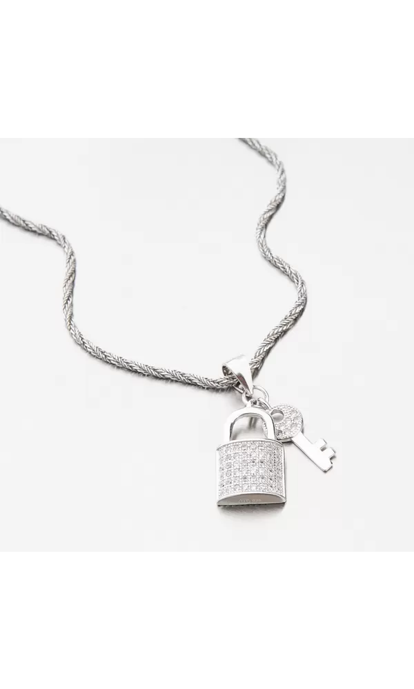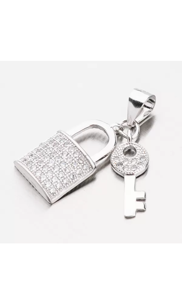 Nápaditý strieborný prívesok v tvare zámku a kľúča je bohato zdobený zirkónmi v briliantovom bruse. Zirkóny sú vsadené metódou microsetting. Jedná sa o klenotnícku techniku ​​vsadzovania malých kameňov, zirkónov alebo diamantov na časť alebo celú plochu šperku s vysokou presnosťou, ktorá sa dosahuje pri veľkom zväčšení za pomoci mikroskopu.