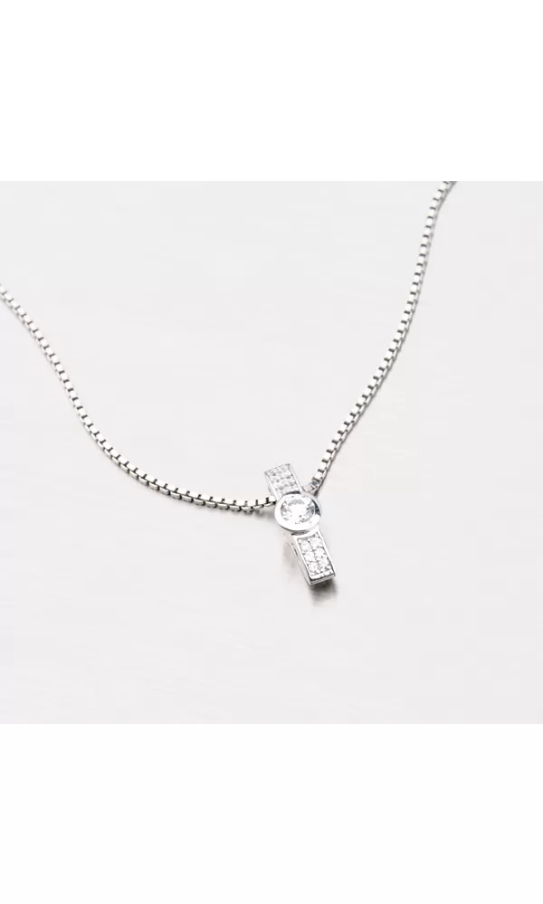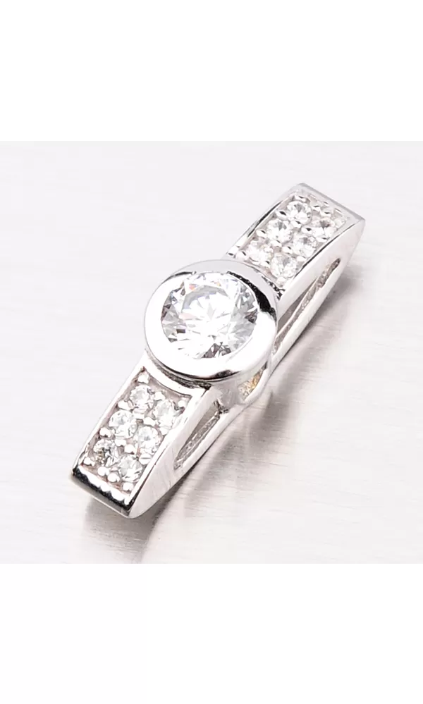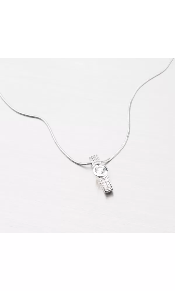 Neprehliadnuteľný moderný prívesok je vyrobený zo striebra rýdzosti 925/1000 s rhodiovaním v lesklej povrchovej úprave. Zdobený je drobnými žiarivými zirkónmi, ktoré sú vsadené technikou microsetting. Uprostred je zdobený jedným väčším zirkónom.