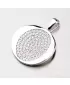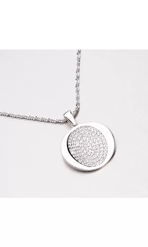 Elegantný prívesok je dekorovaný čírymi zirkónmi v niekoľkých radoch do oválneho tvaru. Prívesok je vyrobený zo striebra rýdzosti 925/1000 v lesklej povrchovej úprave a povrch prívesku je zušľachtený rhodiovaním. Ródium je ušľachtilý drahý kov zo skupiny platinových kovov. Rhodiovaním strieborných šperkov galvanickým nanášaním tohto drahého platinového kovu sa stáva povrch šperku tvrdší, stálejší a odolnejší voči vonkajším vplyvom ako je mechanický oter, poškriabanie, nabiehanie striebra, ľudský pot, kozmetické prípravky a ďalšie. Ródium je antialergické.