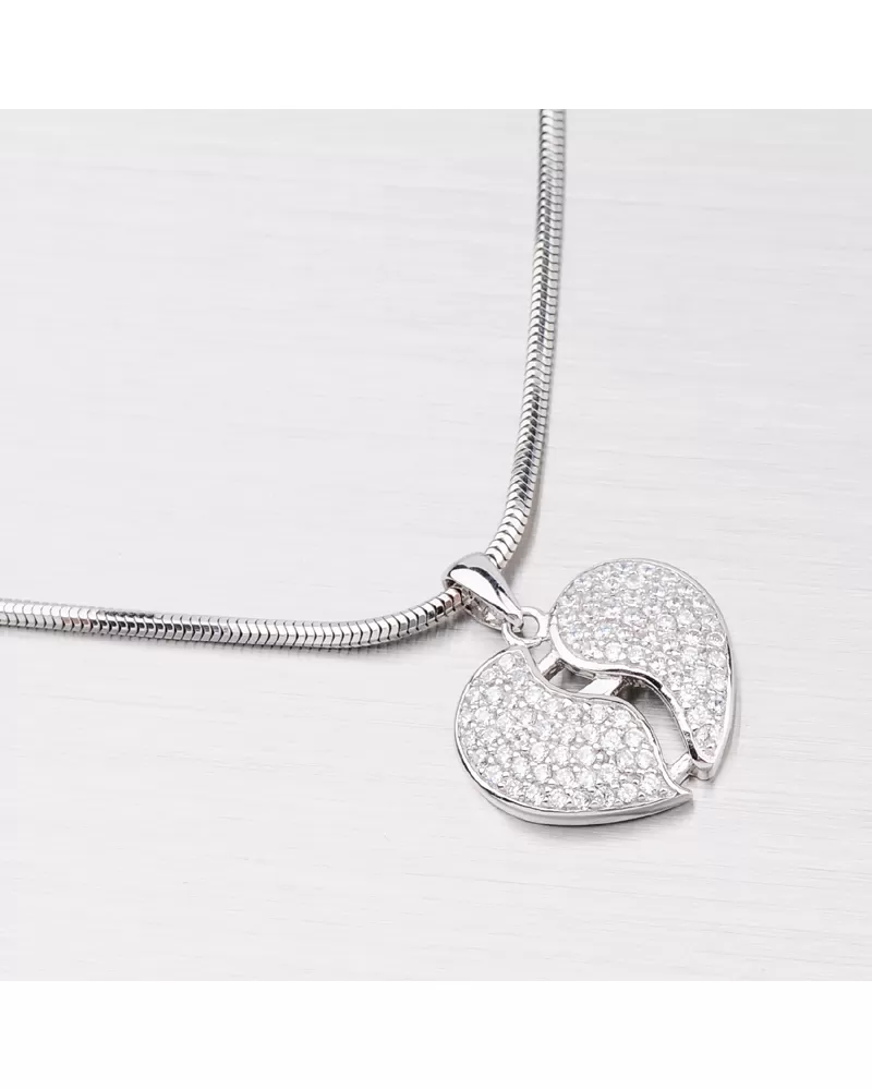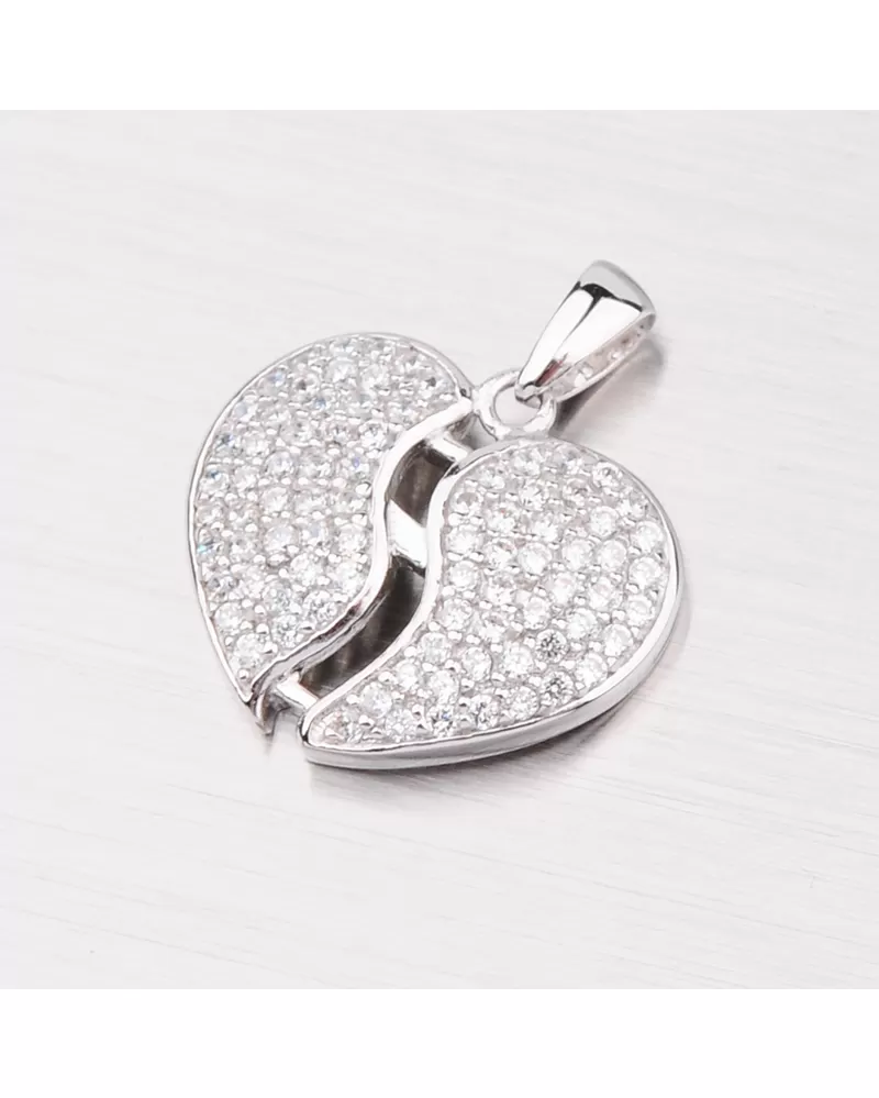 Krásny prívesok v tvare rozdeleného srdca je vyrobený zo striebra rýdzosti 925/1000. Prívesok je vyrobený v lesklej povrchovej úprave a je ozdobený bielymi drobnými zirkónmi, ktoré sú do šperku zasadené technikou microsetting. K tomuto prívesku je vhodné použiť retiazku s priemerom max. 1,75 mm.