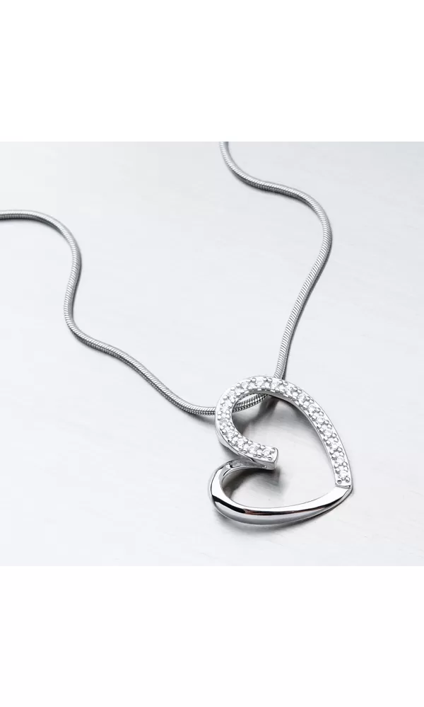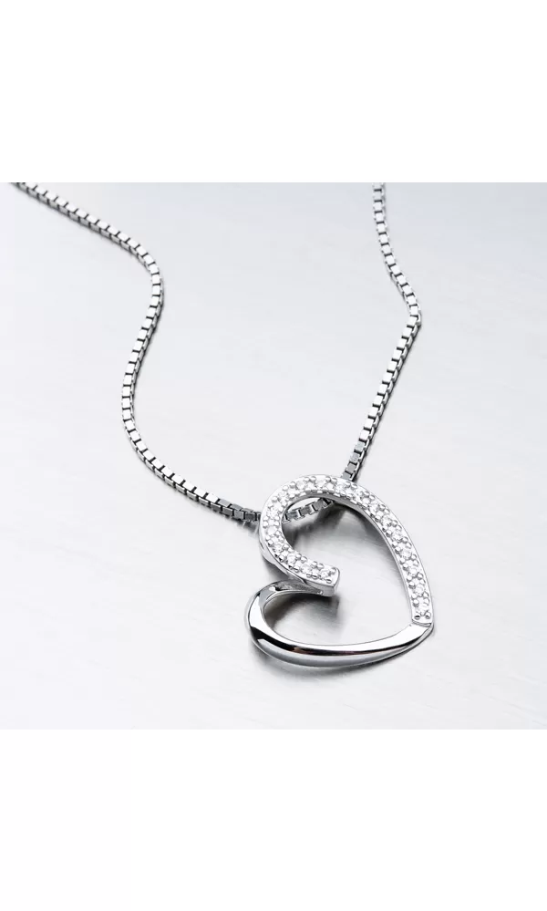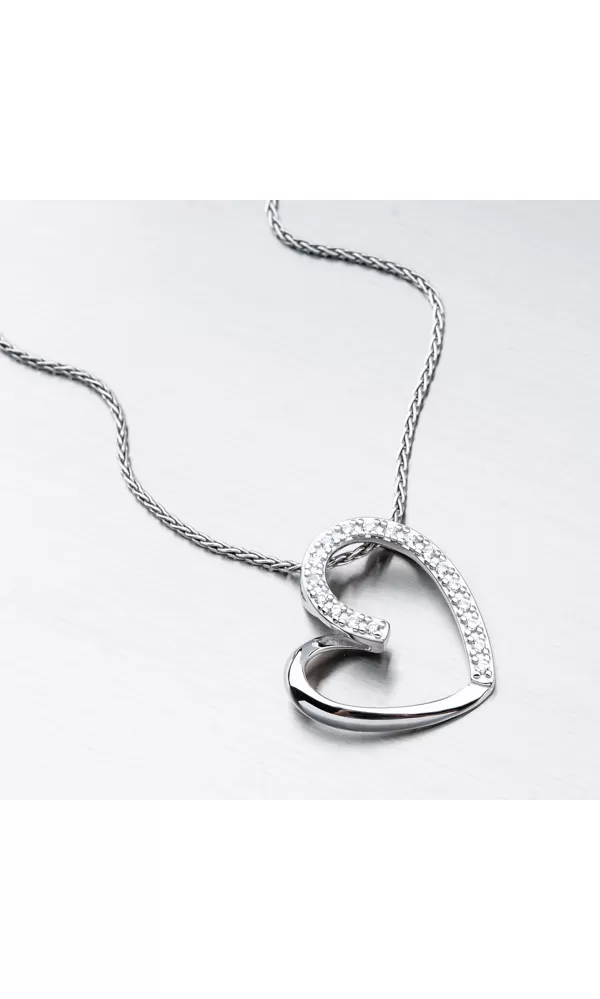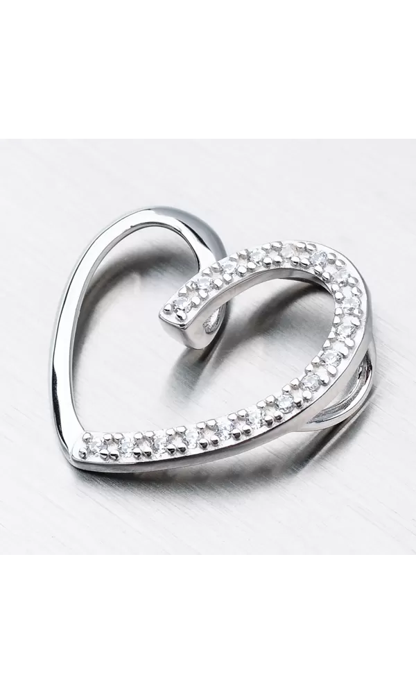 Prívesok v tvare srdca v modernom poňatí vás zaujme na prvý pohľad. Prívesok nemá klasické očko ale retiazka sa prevlieka na zadnej strane prívesku, kde sú očká na pevno letované. Prívesok je z polovice vysadený zirkónmi v briliantovom bruse.