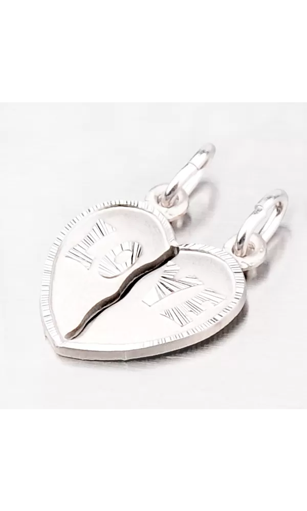Tento krásny prívesok v tvare srdca sú v skutočnosti prívesky dva, ktoré si môžu partneri spoločne rozdeliť. Prívesky sú vyrobené zo striebra o rýdzosti 925/1000 s lesklou a matnou povrchovou úpravou. Nápis LOVE a obrys celého srdca je upravený gravírovanými facetami robenými pomocou nástroja s diamantovou hlavou, ktoré dodávajú šperku maximálny lesk a brilanciu zo všetkých uhlov.  Povrch prívesku je navyše zušľachtený rhodiovaním. Ródium je ušľachtilý drahý kov zo skupiny platinových kovov. Rhodiovaním strieborných šperkov galvanickým nanášaním tohto drahého platinového kovu sa stáva povrch šperku tvrdší, stálejší a odolnejší voči vonkajším vplyvom ako je mechanický oter, poškriabanie, nabiehanie striebra, ľudský pot, kozmetické prípravky a ďalšie. Ródium je antialergické.