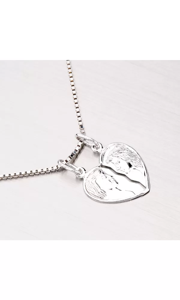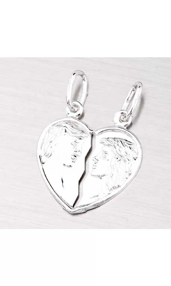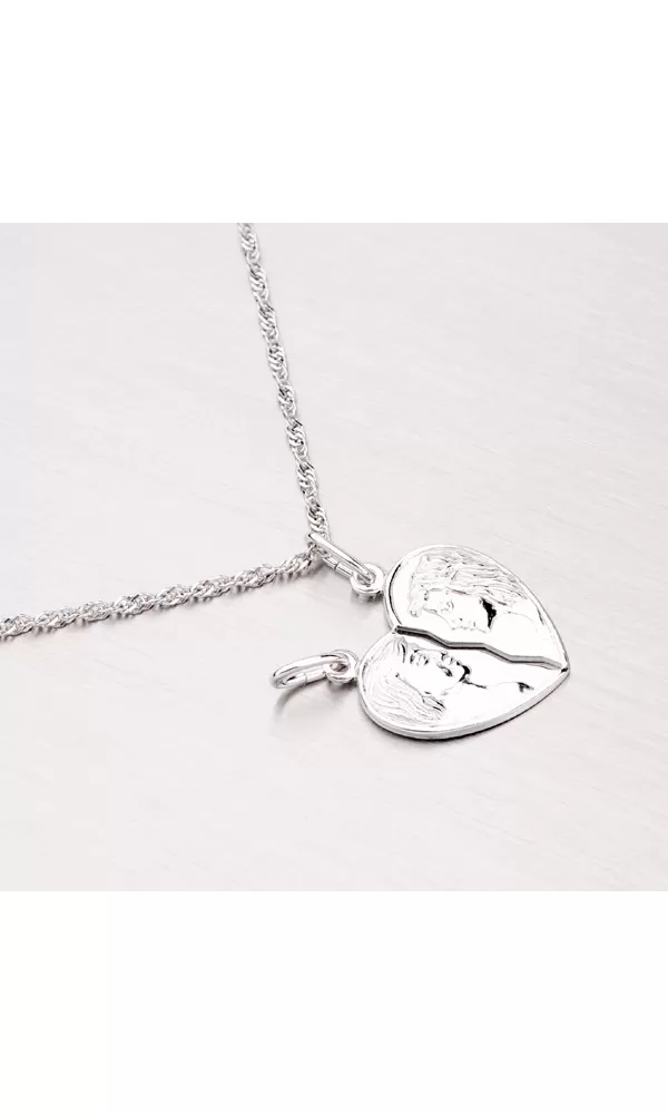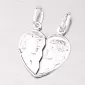 Romantická sada príveskov pre pár v tvare srdca je vyrobená z rhodiovaného striebra rýdzosti 925/1000 v lesklej povrchovej úprave. Prívesok zdobí jemné ručné gravírovanie. Rozlomením docielite dva identické prívesky.