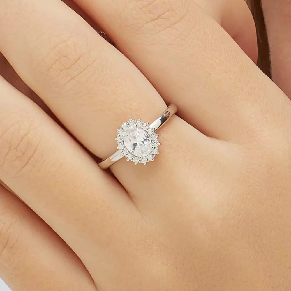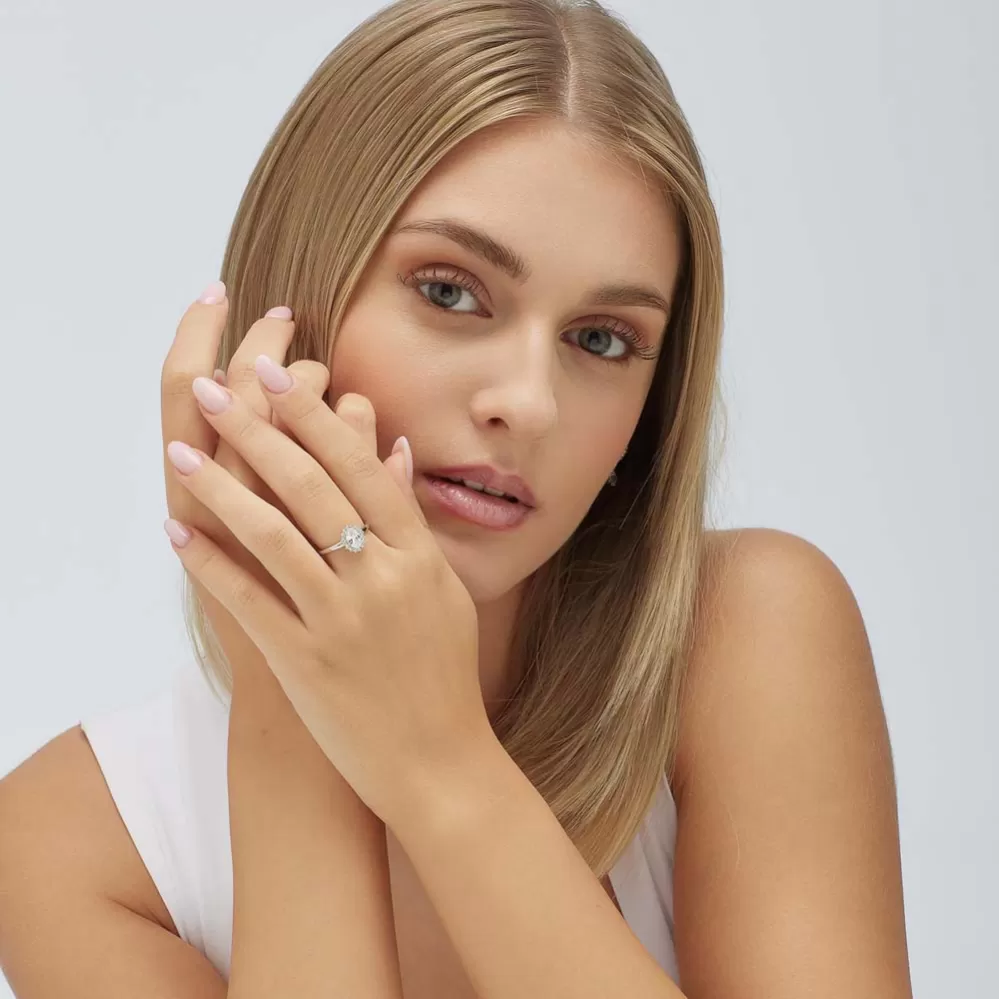 Žiarivý, dámsky prsteň je vyrobený zo striebra rýdzosti 925/1000, ktoré je zušľachtené rhodiovaním.. Rhodium je ušľachtilý drahý kov zo skupiny platinových kovov. Rhodiovaním strieborných prsteňov galvanickým nanášaním tohto drahého kovu sa stáva povrch šperku tvrdší, stálejší a odolnejší voči vonkajším vplyvom ako je mechanický oter, poškriabanie, nabiehanie striebra, ľudský pot, kozmetické prípravky a ďalšie. Ródium je antialergické. Strieborný prsteň je zdobený jedným veľmi precízne brúseným zirkónom a menšími zirkónmi vsadenými dookola.