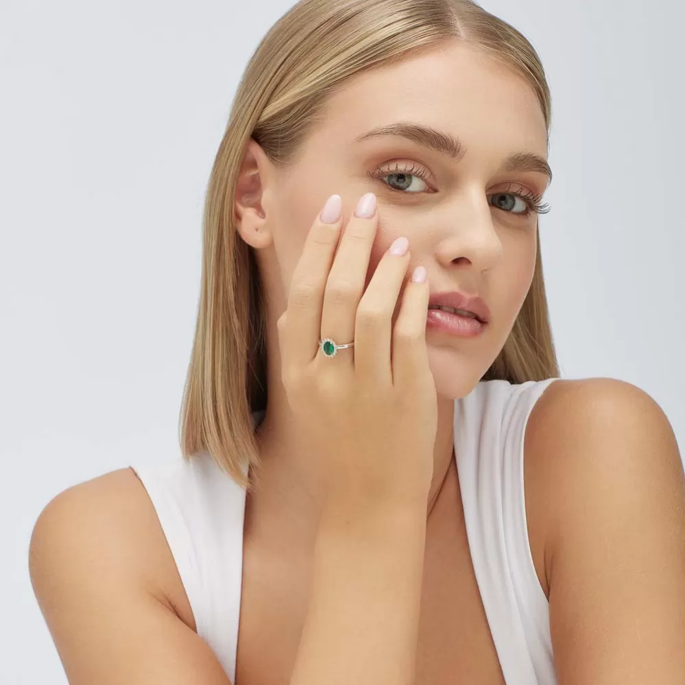 Žiarivý, dámsky prsteň je vyrobený zo striebra rýdzosti 925/1000, ktoré je zušľachtené rhodiovaním.. Rhodium je ušľachtilý drahý kov zo skupiny platinových kovov. Rhodiovaním strieborných prsteňov galvanickým nanášaním tohto drahého kovu sa stáva povrch šperku tvrdší, stálejší a odolnejší voči vonkajším vplyvom ako je mechanický oter, poškriabanie, nabiehanie striebra, ľudský pot, kozmetické prípravky a ďalšie. Ródium je antialergické. Strieborný prsteň je zdobený jedným veľmi precízne brúseným zirkónom a menšími zirkónmi vsadenými dookola.